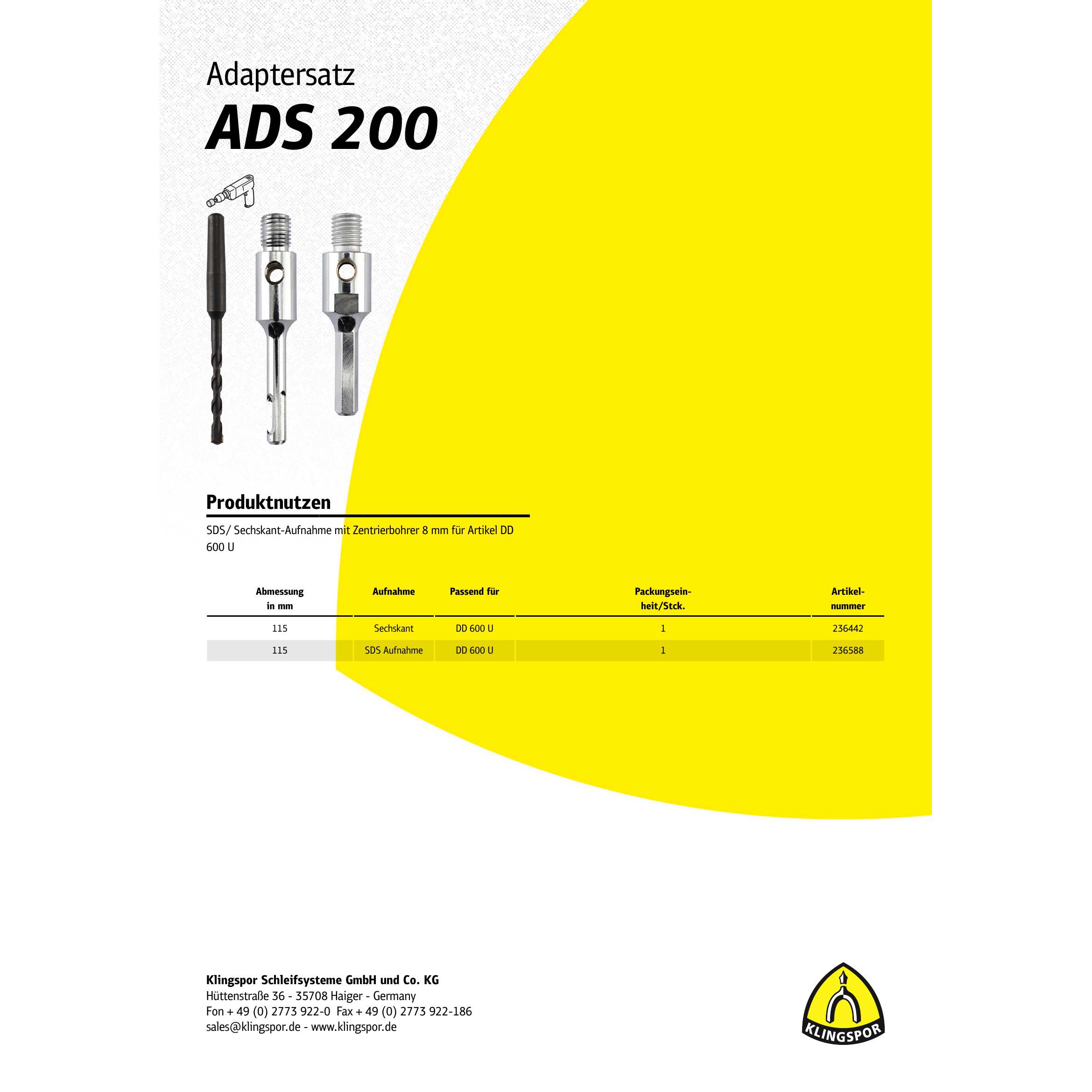 Besonderheiten: Der Klingspor ADS 200 Adaptersatz ist aus hochwertigen Materialien gefertigt und bietet eine SDS-/Sechskant-Aufnahme mit einem Zentrierbohrer