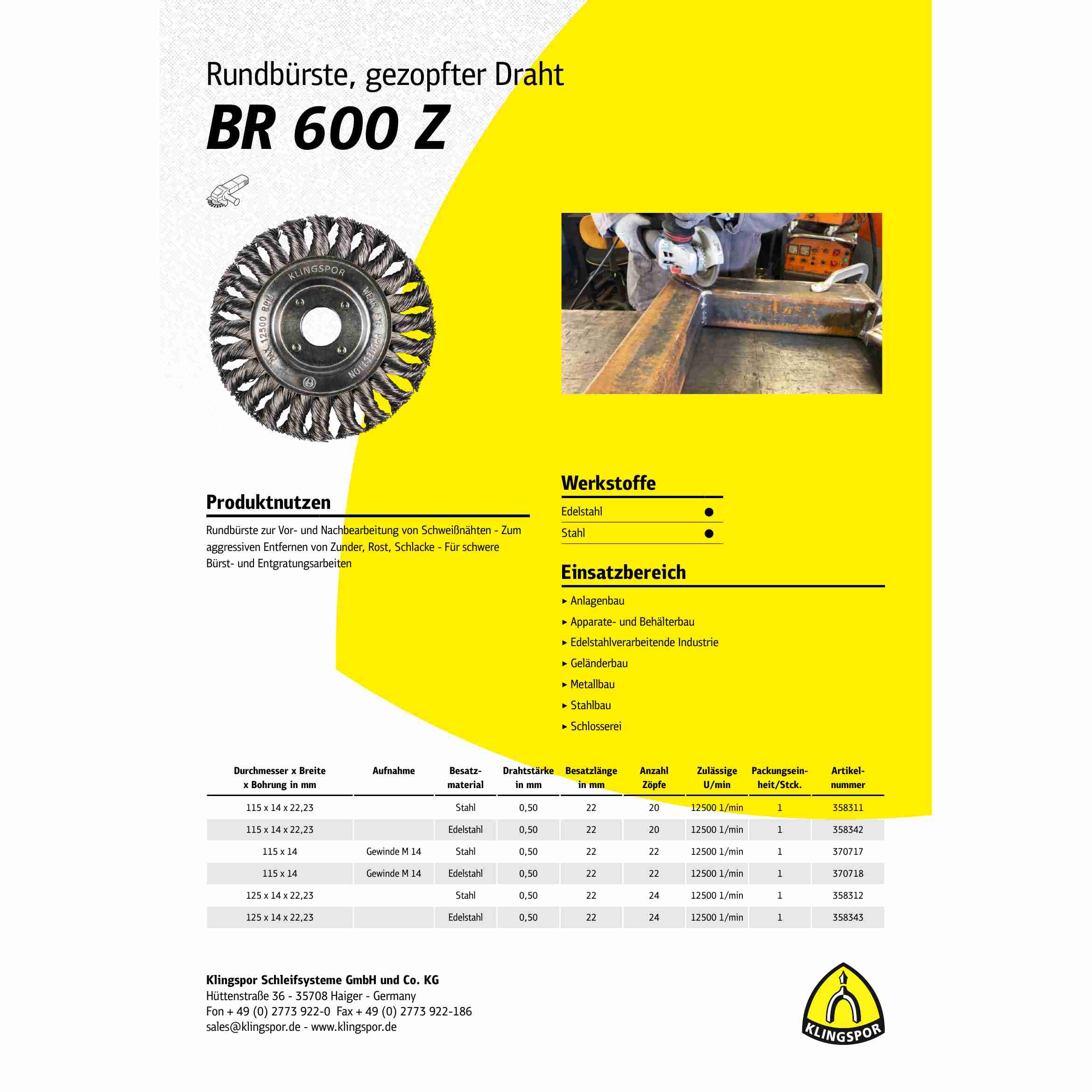 1 x Klingspor BR 600 Z Rundbürste gezopft einreihig 125 x 14 mm Gewinde M 14 0,5 Stahl