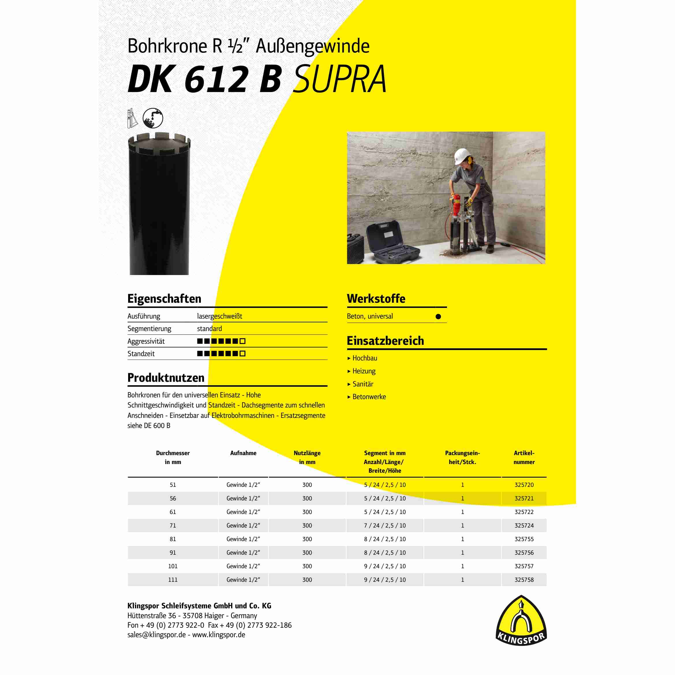 Die Klingspor DK 612 B Bohrkrone ist eine ausgezeichnete Wahl für Profis, die eine zuverlässige und leistungsstarke Bohrkrone benötigen. Mit ihrer hohen Aggressivität und langen Standzeit ist sie ideal für den Einsatz auf Baustellen und in anderen anspruchsvollen Umgebungen geeignet.