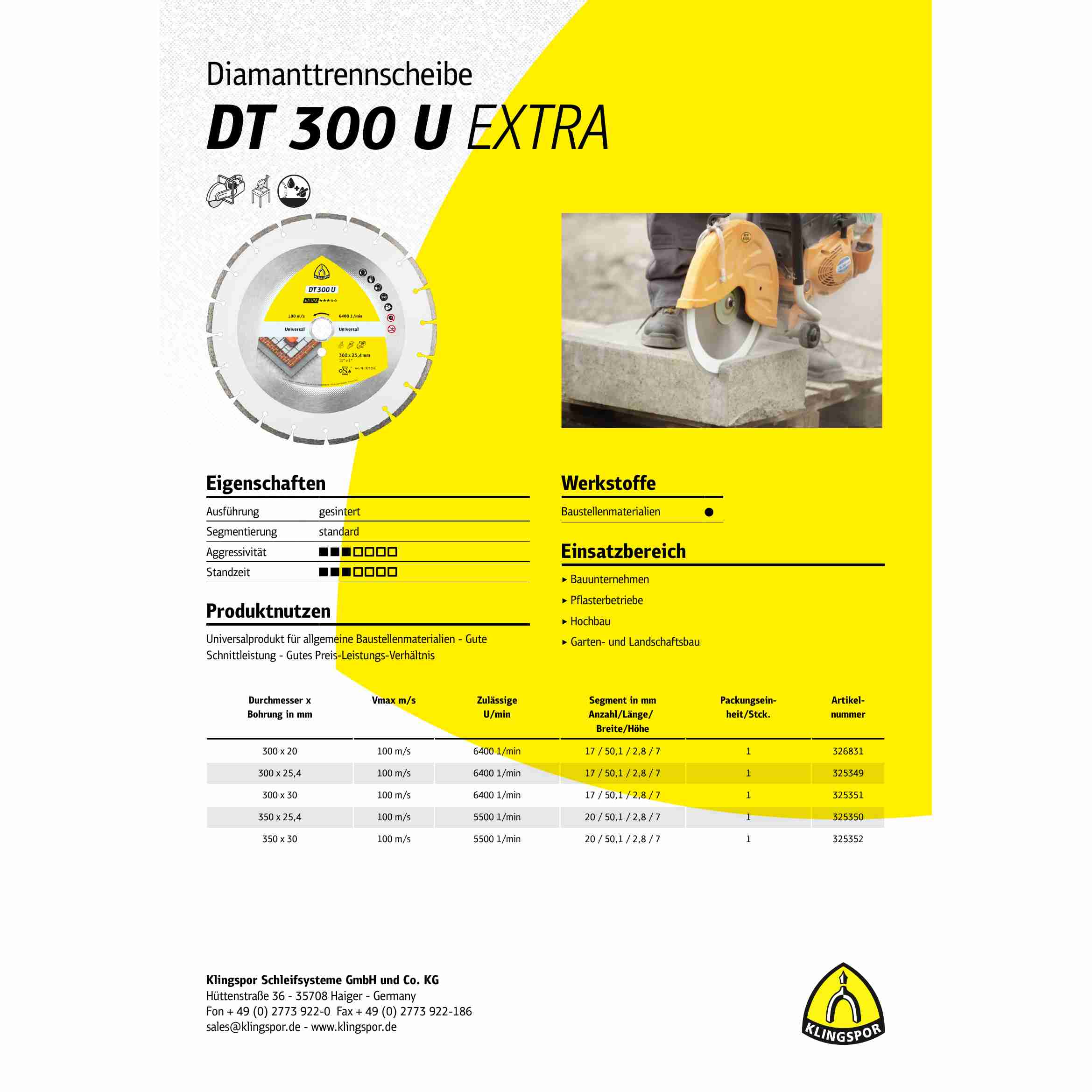 Merkmale: Die Universalscheibe DT 300 U Extra mit Standardsegmentierung ist ideal für das Schneiden von Beton und anderen Baumaterialien. Sie bietet bewährte Klingspor Markenqualität mit guter Schnittleistung zum attraktiven Preis