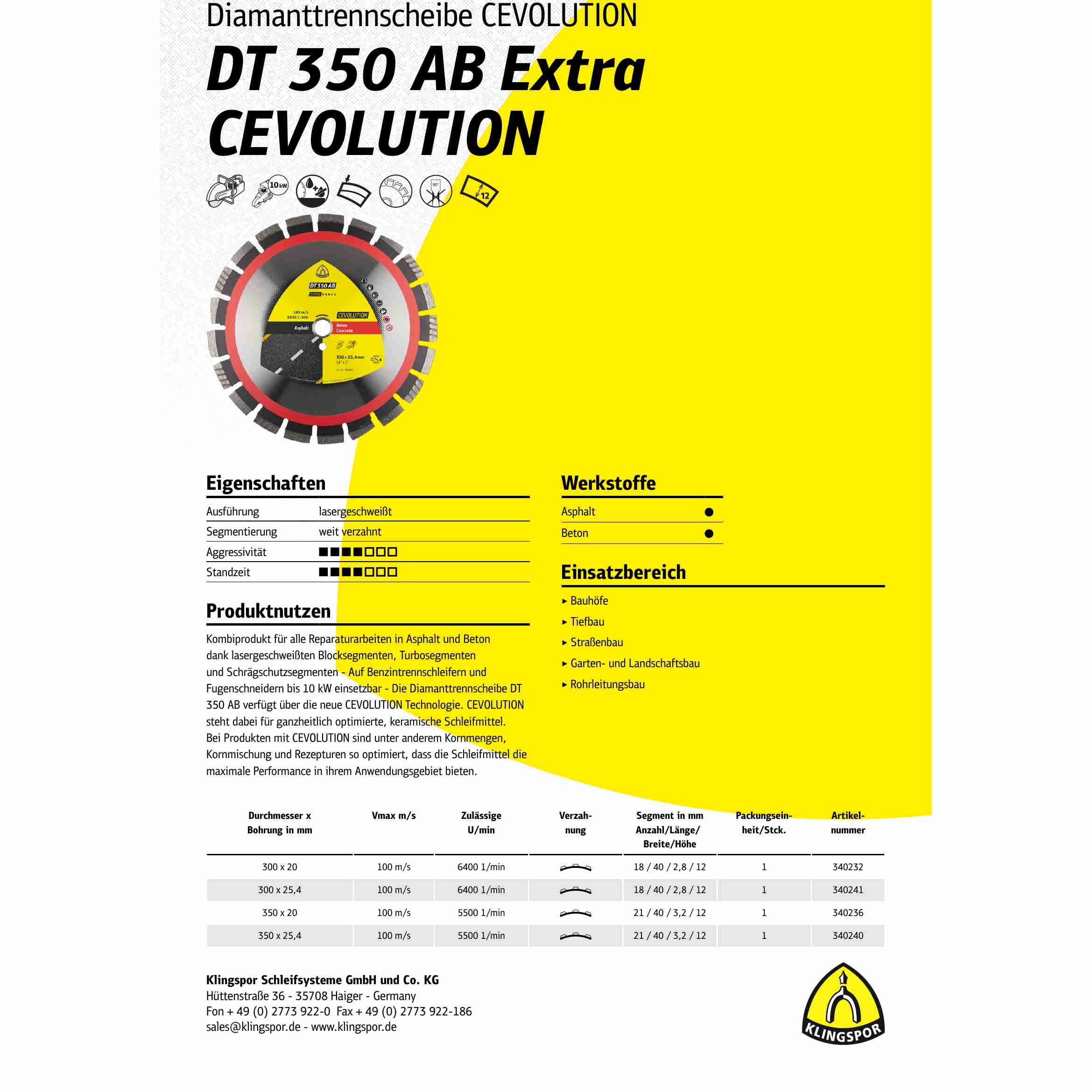 Vorteile: Kombiprodukt für alle Reparaturarbeiten in Asphalt und Beton dank lasergeschweißten Blocksegmenten, Turbosegmenten und Schrägschutzsegmenten - Auf Benzintrennschleifern und Fugenschneidern bis 10 kW einsetzbar