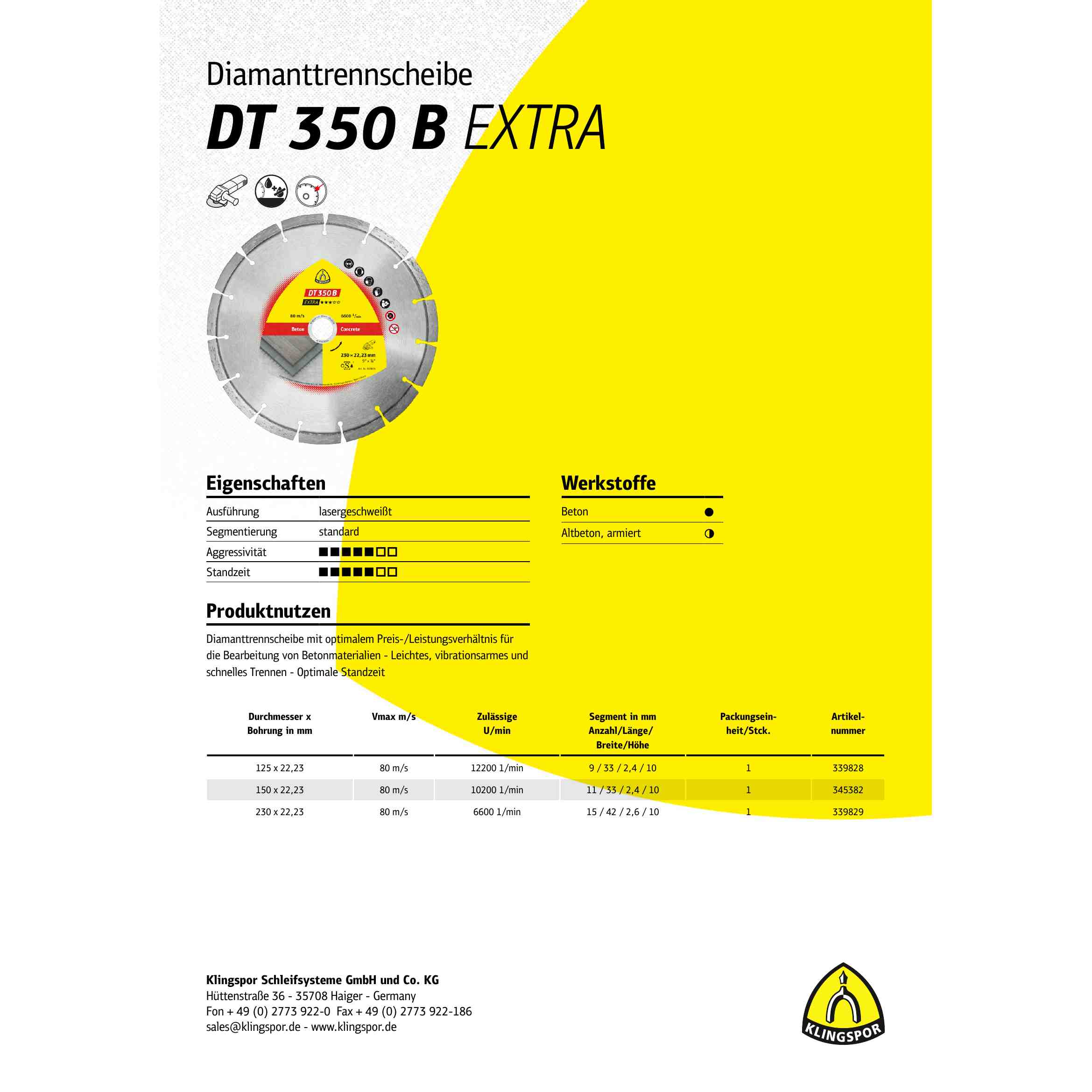 Die Klingspor DT 350 B Diamanttrennscheiben sind die perfekte Wahl für die Bearbeitung von Betonmaterialien. Mit ihrem optimalen Preis-/Leistungsverhältnis bieten sie eine hohe Qualität zu einem erschwinglichen Preis.