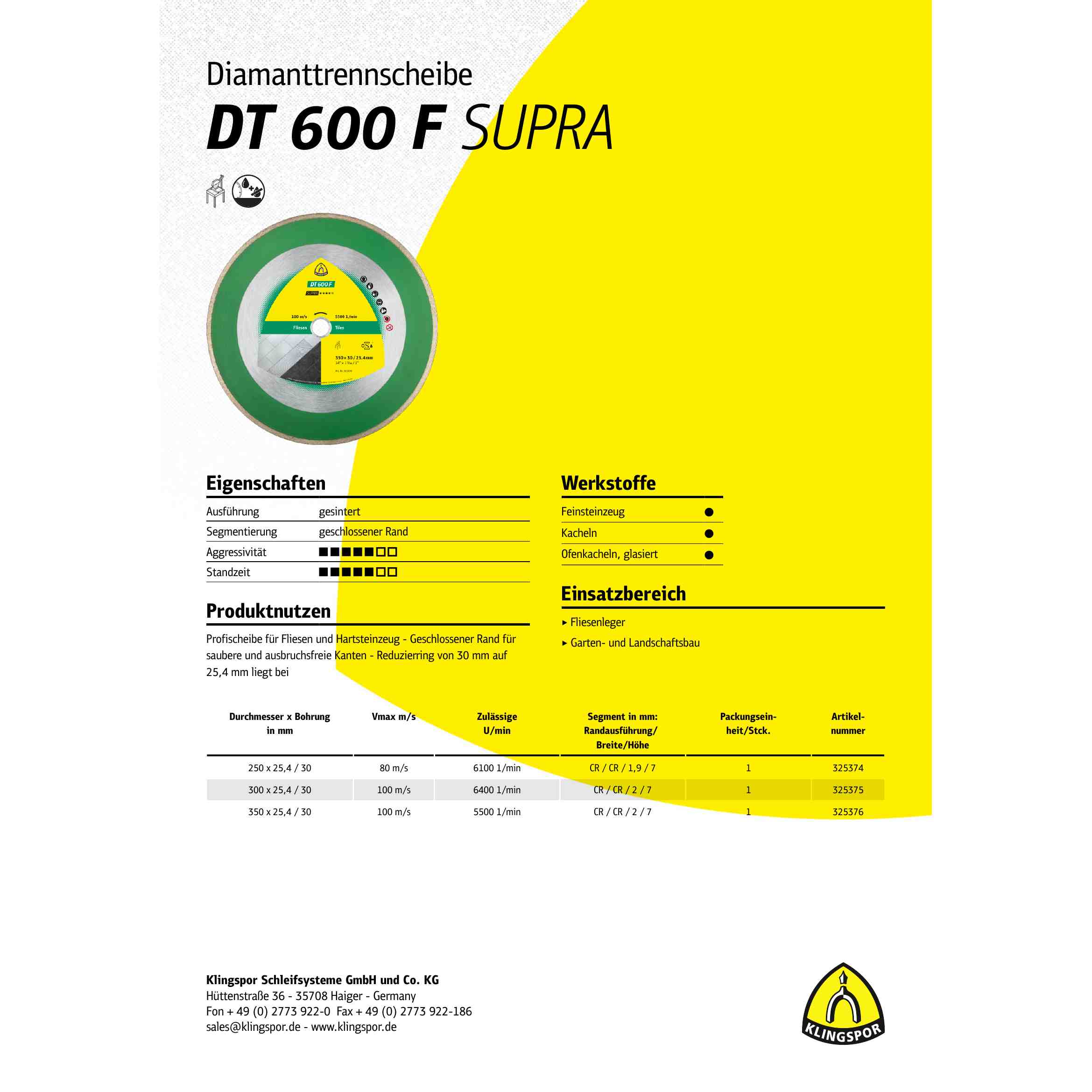 Besonderheiten: Die DT 600 F Supra Diamanttrennscheibe von Klingspor ist ideal für ein schnelles und sauberes Schneiden von Fliesen und Hartsteinzeug. Sie bietet ein besonders gutes Preis