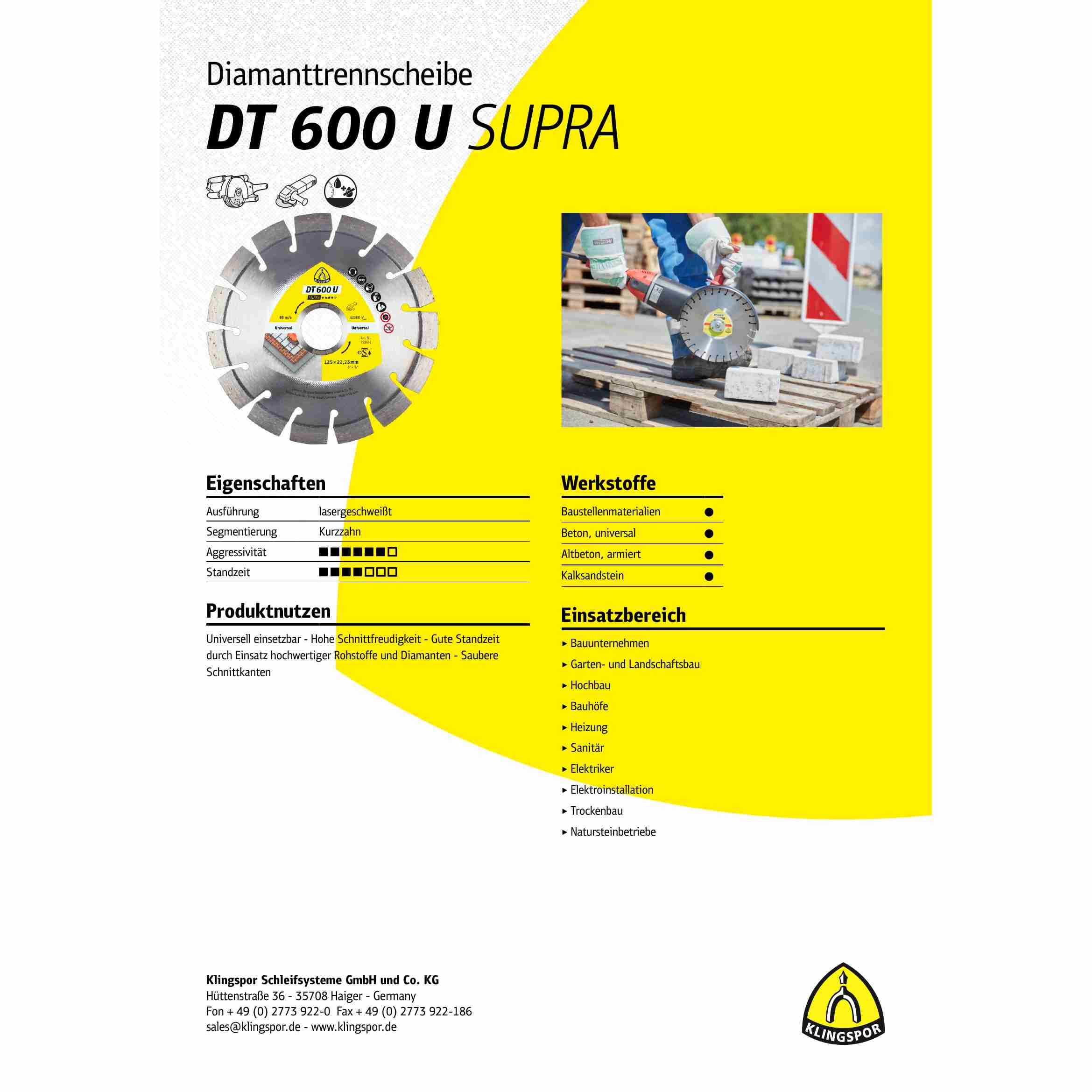 Merkmale: Die lasergeschweißte Universalscheibe DT 600 U Supra ist ein Topseller und ideal für das saubere Schneiden von Beton und Baumaterialien. Sie bietet eine extrem hohe Vielseitigkeit und überzeugt durch ihr besonders gutes Preis