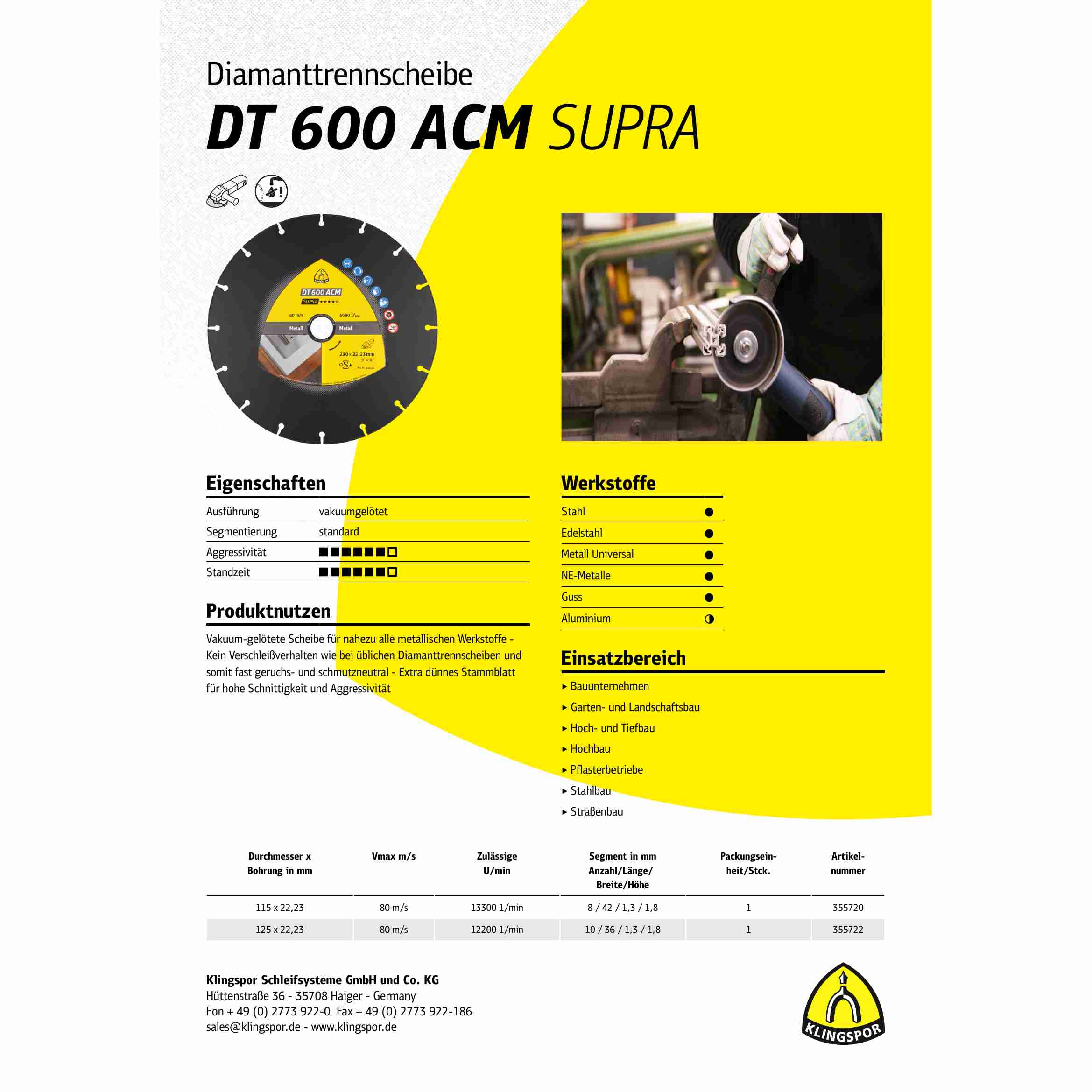 1 x Klingspor DT 600ACM Diamanttrennscheiben, 125 x 1,3 x 22,23 mm 10 Segmente 36 x 1,3 x 1,8 mm, VG - Vakuumgelötet