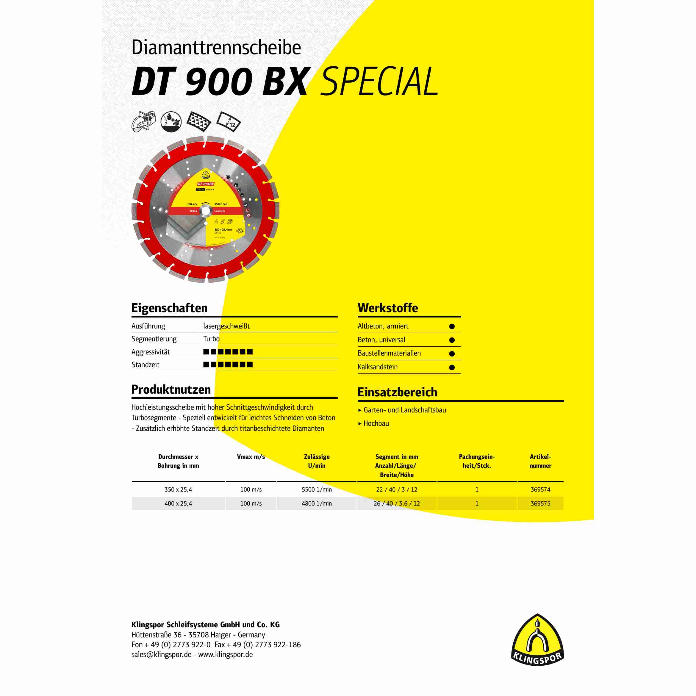 1 x Klingspor DT 900 BX Diamanttrennscheiben 400 x 3,6 x 25,4 mm 26 Segmente 40 x 3,6 x 12 mm Standardverzahnung