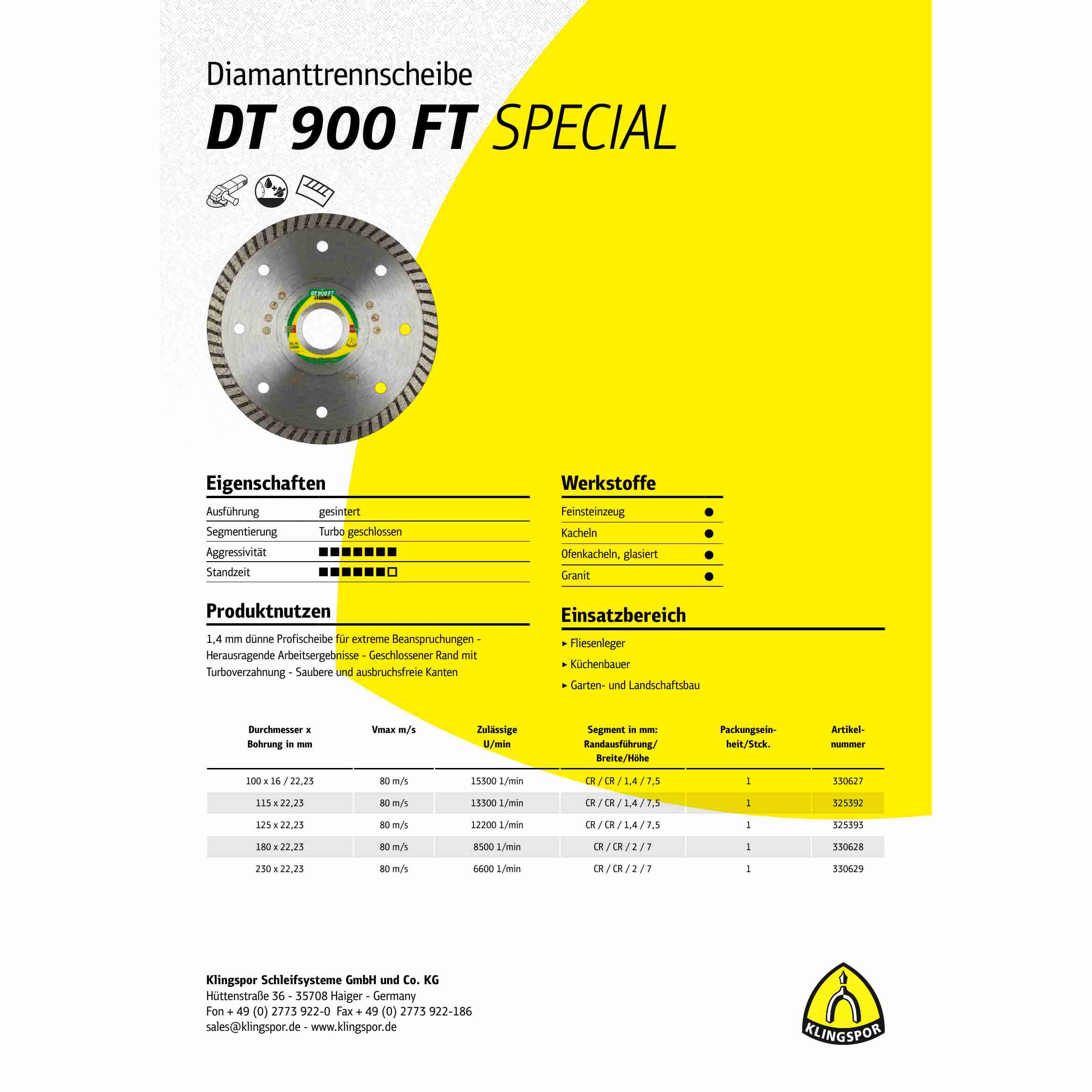 1 x Klingspor DT 900 FT Diamanttrennscheiben, 180 x 2 x 22,23 mm 2 x 7 mm, geschlossener Rand Turbo
