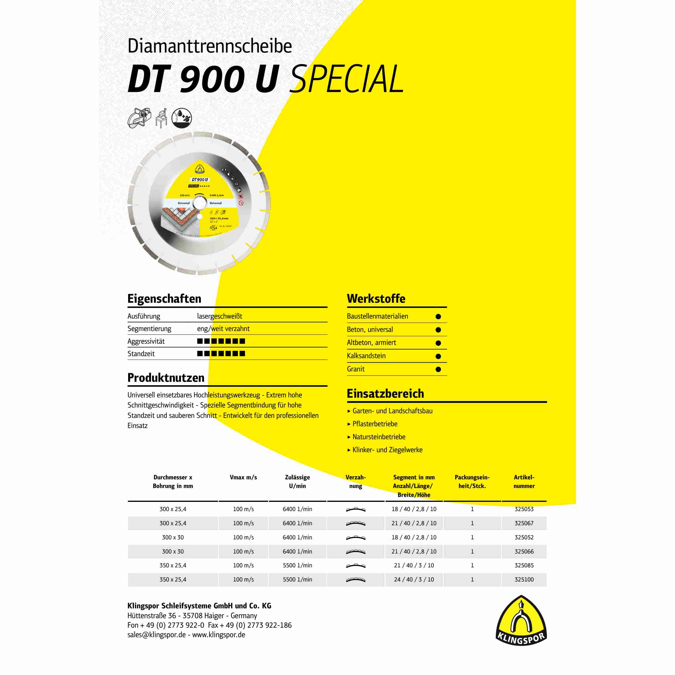 Besonderheiten: Die Klingspor DT 900 U Diamanttrennscheiben sind eine robuste und langlebige Universalscheibe, speziell entwickelt für den professionellen Einsatz bei harten Baumaterialien, Beton und Gestein
