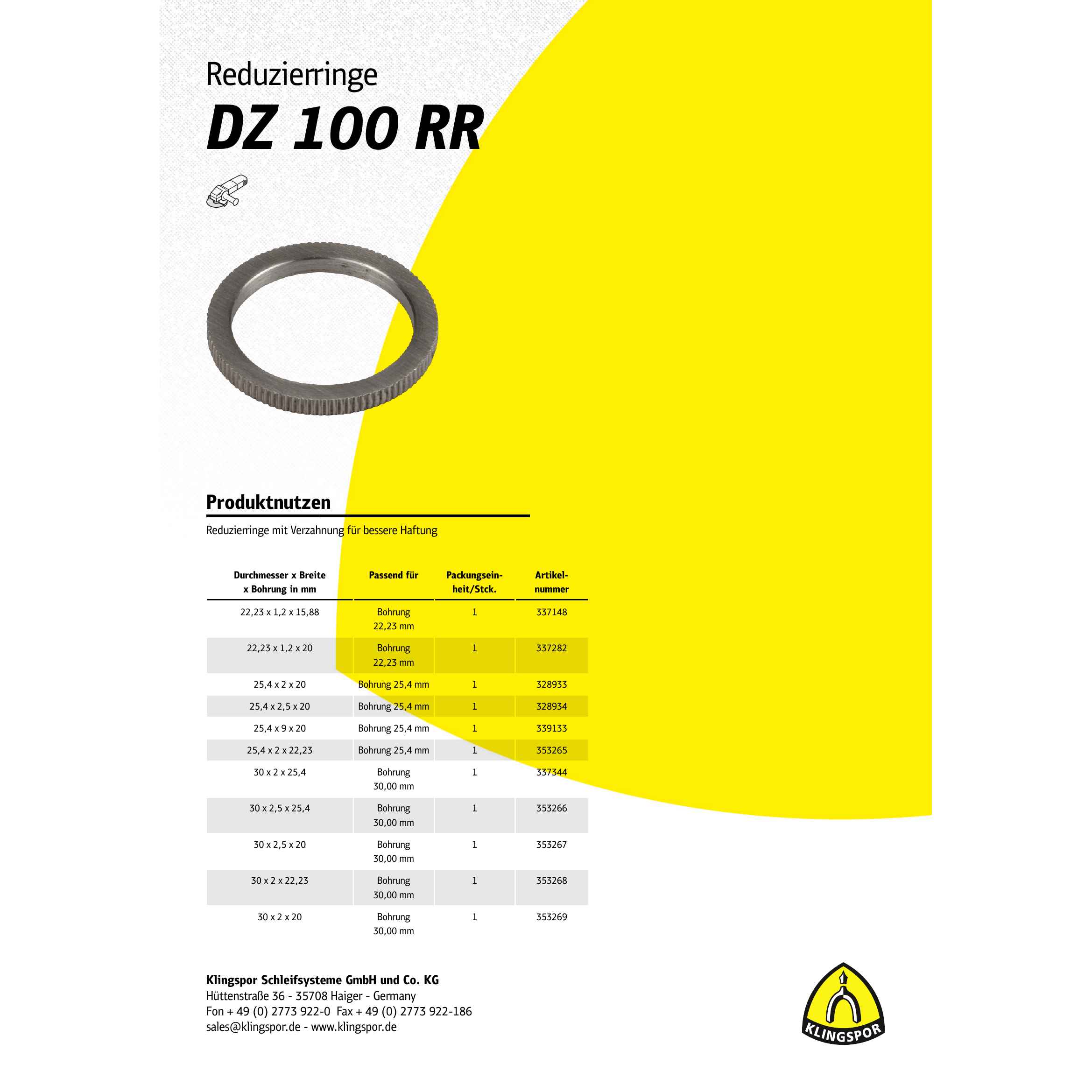 Besonderheiten: Der Klingspor DZ 100 RR Reduzierring - ein unverzichtbares Zubehör für Ihre Werkzeuge. Mit seiner einzigartigen Verzahnung bietet er eine verbesserte Haftung, die für eine sichere und effiziente Nutzung Ihrer Werkzeuge sorgt