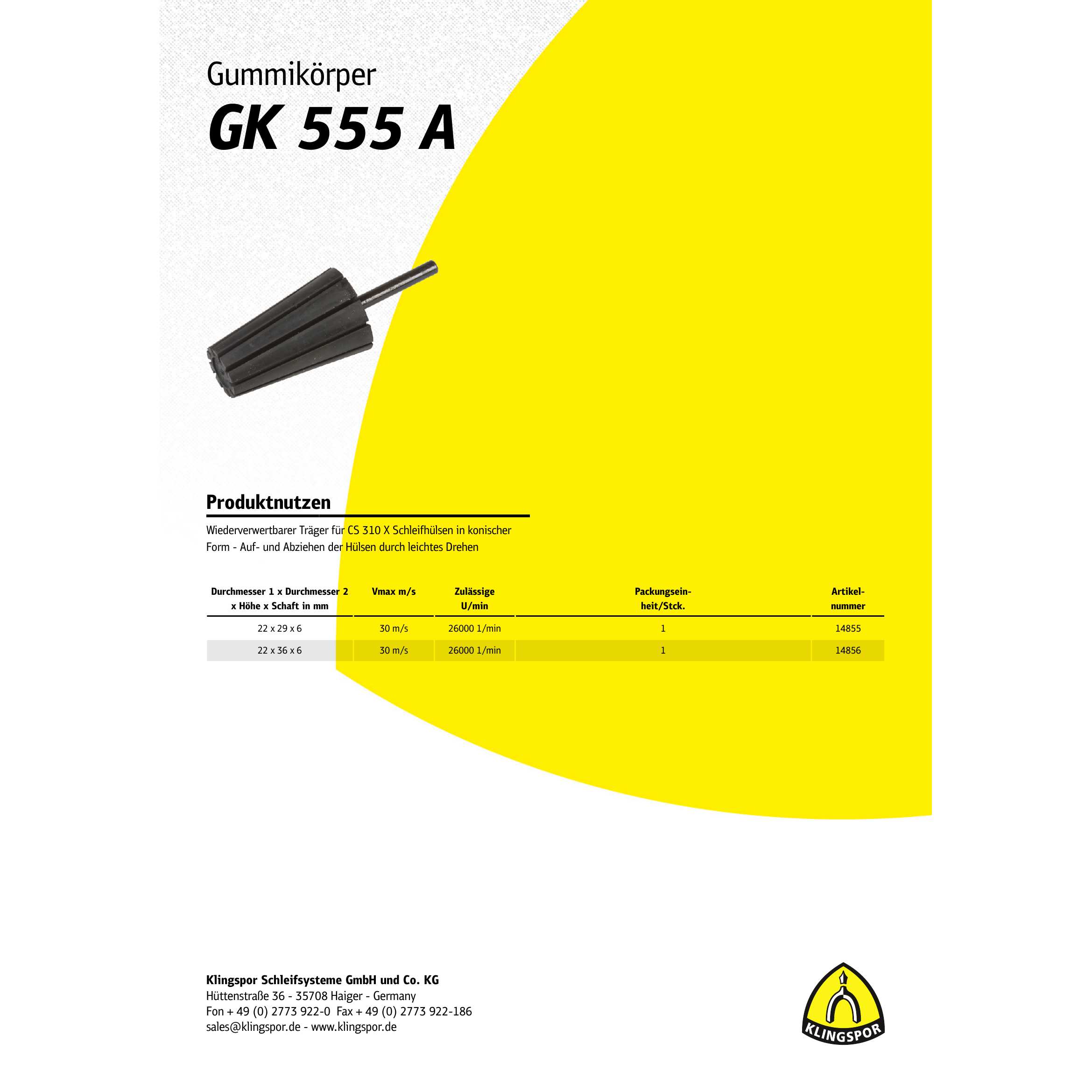 Merkmale: Der Klingspor GK 555 A Gummikörper ist ein wiederverwertbarer Träger für CS 310 X Schleifhülsen. Das Auf- und Abziehen der Hülsen geschieht durch leichtes Drehen