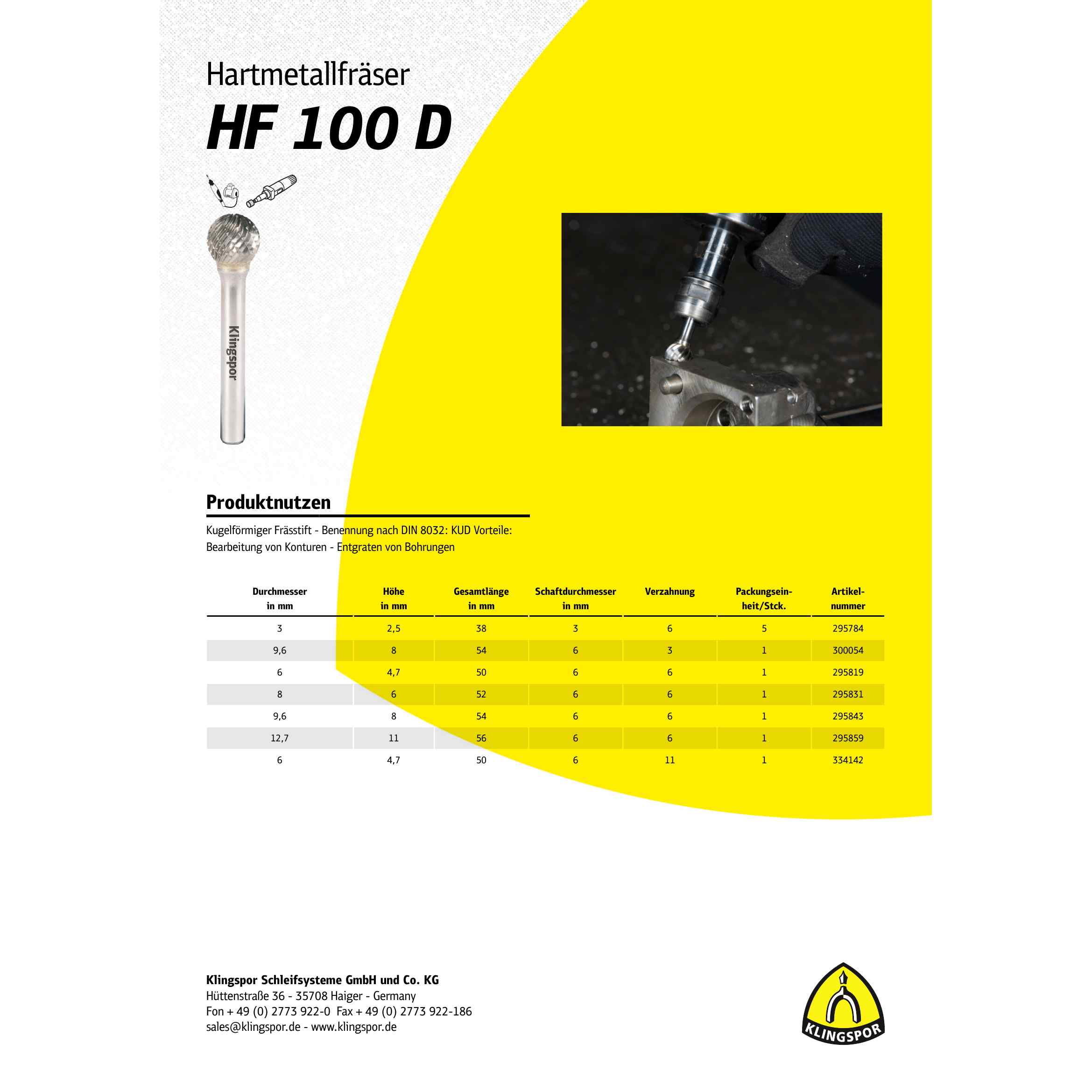 Merkmale: Der Klingspor HF 100 D Hartmetallfräser zeichnet sich durch seinen kugelförmigen Frässtift aus und ist somit ideal für das Bearbeiten von Konturen und das Entgraten geeignet