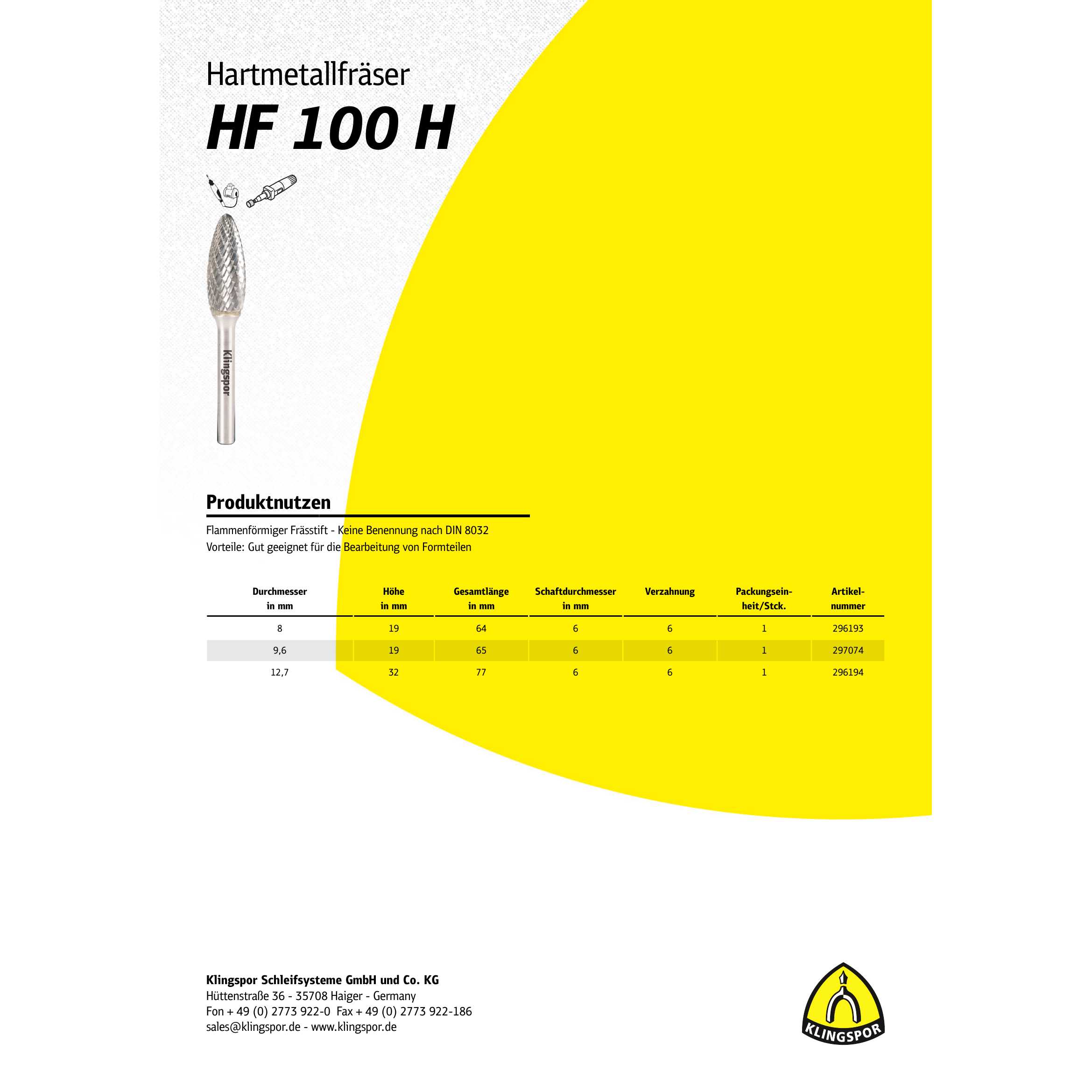 Vorteile: Der Klingspor HF 100 H Hartmetallfräser mit seinem flammenförmigen Frässtift ist ideal für die präzise Bearbeitung von Formteilen. Der vielseitige Fräser bietet eine hohe Abtragsleistung und lange Standzeiten bei einer Vielzahl von Anwendungen