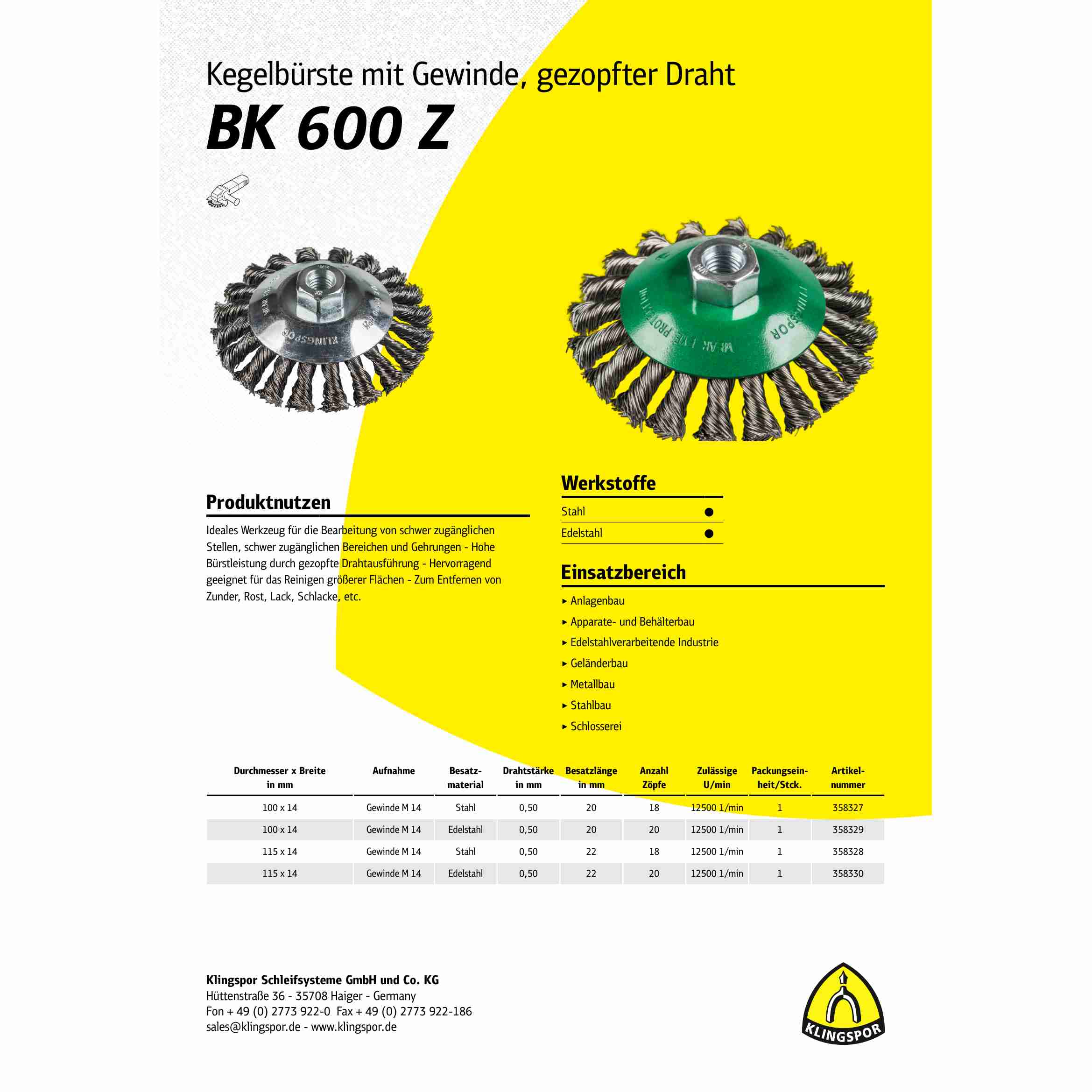 1 x Klingspor Kegelbürste gezopft Anzahl Reihen 1, 115 mm, Gewinde M 14 0,5 Edelstahl