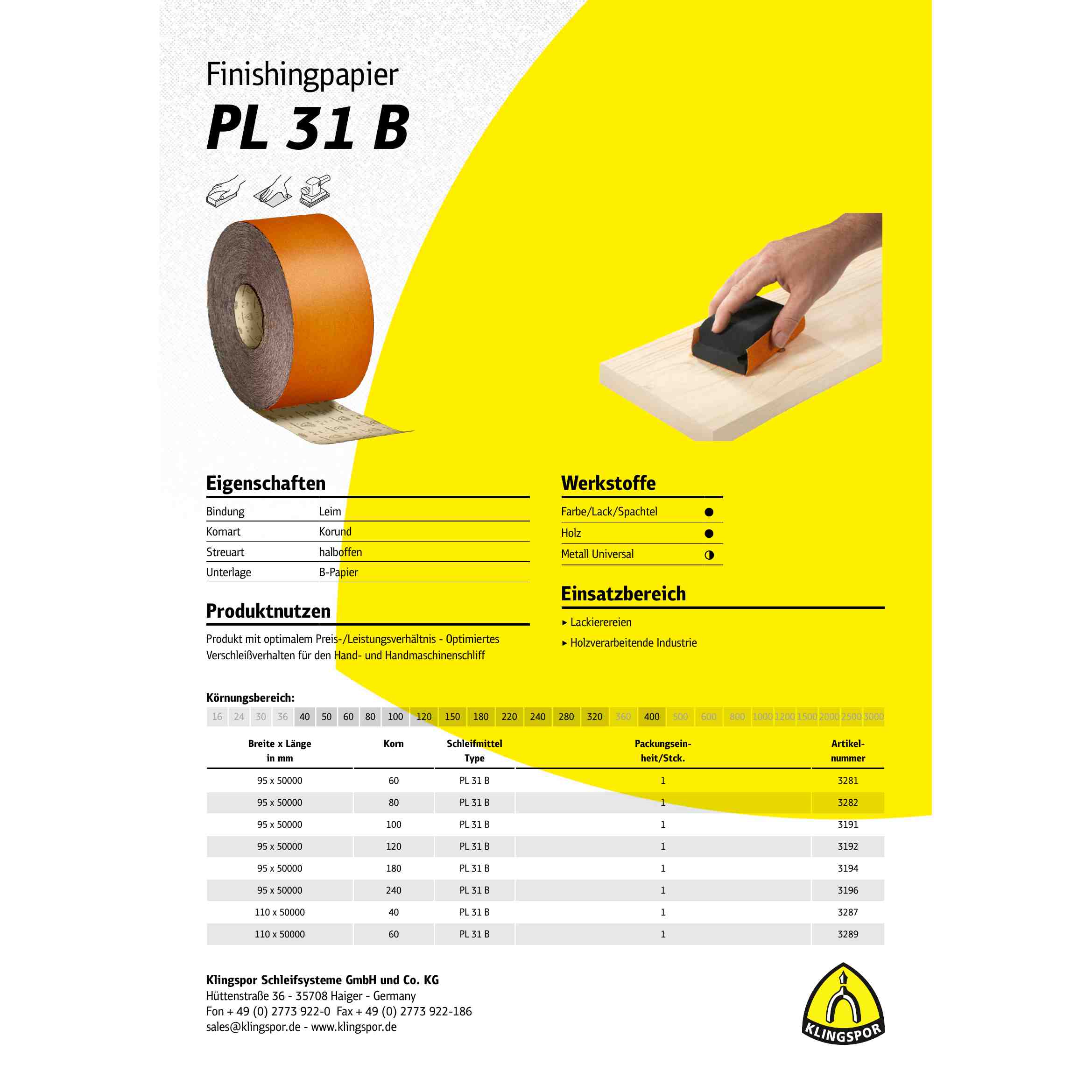 Insgesamt sind die Klingspor PL 31 B Rollen eine ausgezeichnete Wahl für alle, die ein hochwertiges Finishingpapier mit einem optimalen Preis-/Leistungsverhältnis suchen. Mit ihrer erhöhten Standzeit und ihrem feineren Oberflächenbild bieten sie eine hervorragende Leistung und sind ideal für eine Vielzahl von Anwendungen geeignet.