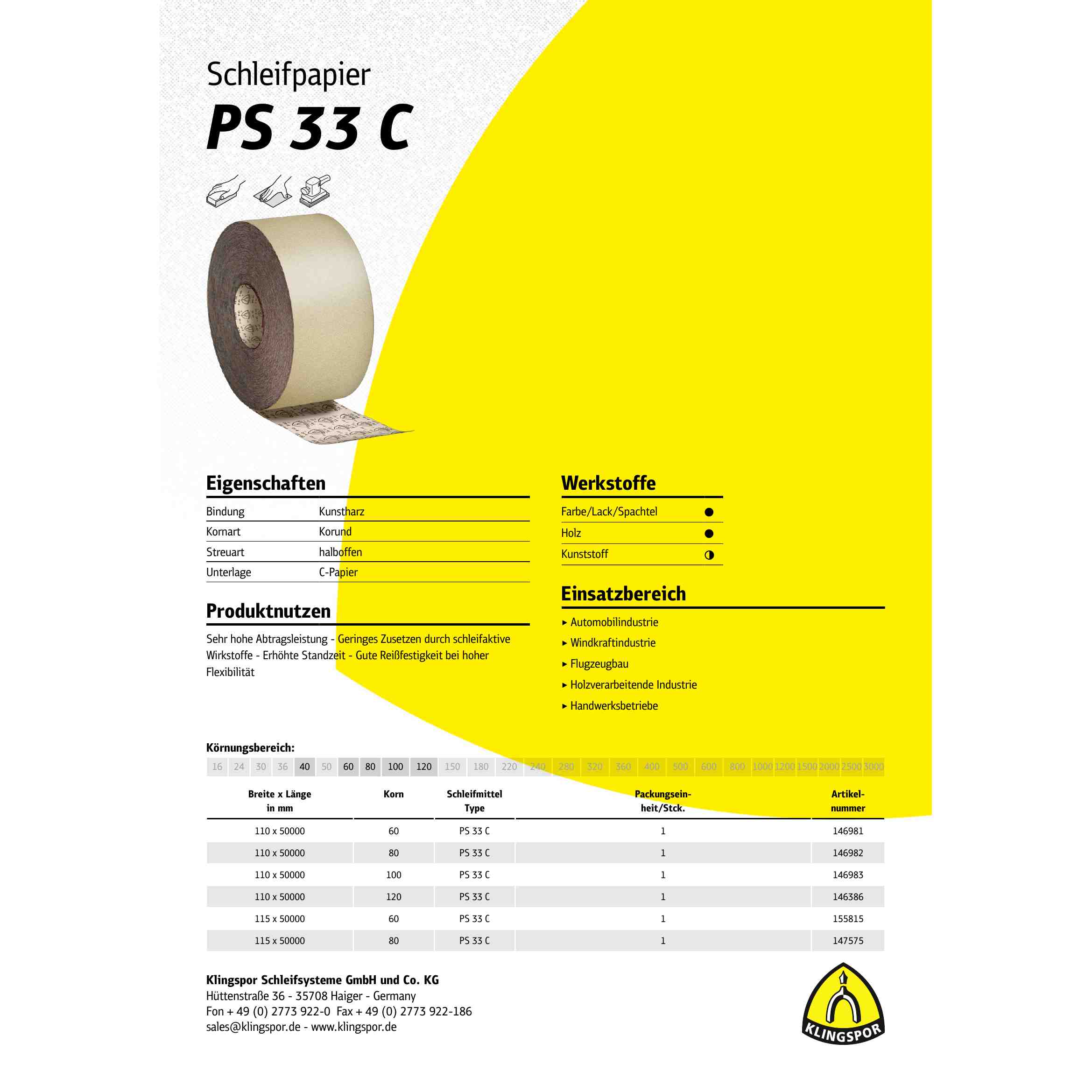 Vorteile: Das Klingspor PS 33 C Schleifpapier, eine hochwertige Rolle mit einer Größe von 115x50000mm und einem Korn von 120, überzeugt besonders bei der Bearbeitung von Farbe, Lack und Spachtel