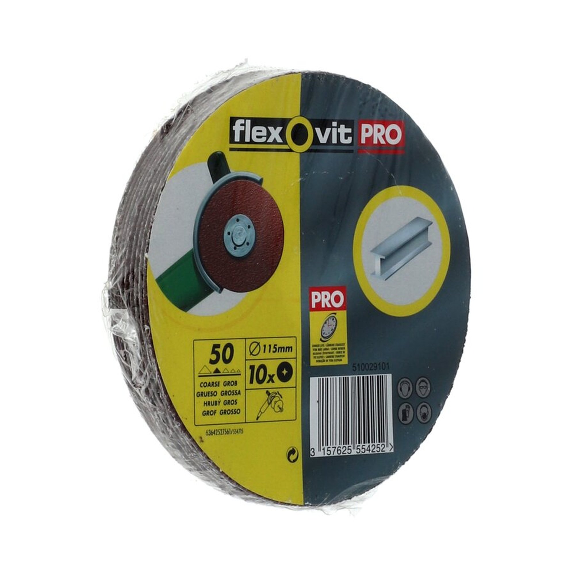 10er-Pack Flexovit Fiberscheiben, 115x22mm, Körnung 50, ideal für effektives Schleifen von Stahl mit Winkelschleifern.,