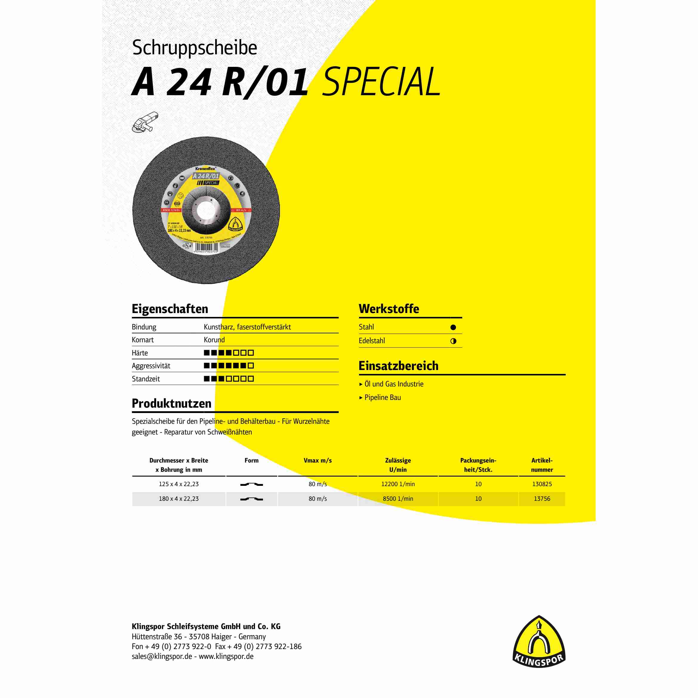Besonderheiten: Die Klingspor A 24 R 01 Schruppscheiben sind eine hochwertige Spezialscheibe, die speziell für den Einsatz im Pipeline- und Behälterbau sowie für die Schweißnahtbearbeitung im Stirnschliff entwickelt wurde