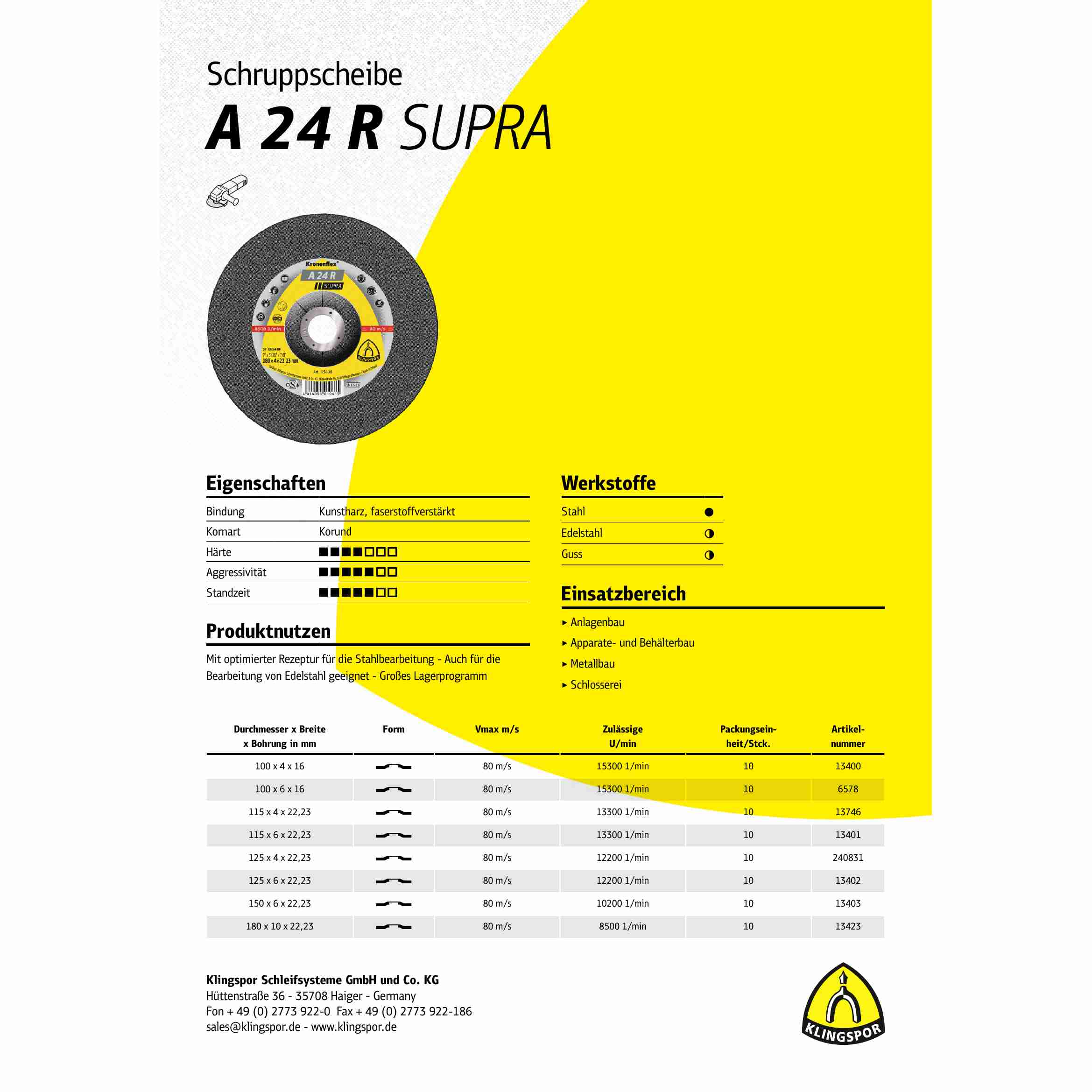 Insgesamt sind die Klingspor A 24 R Schruppscheiben eine ausgezeichnete Wahl für alle, die eine hohe Schleifleistung und Standzeit bei der Bearbeitung von Stahl, Edelstahl und Gussteilen benötigen. Mit ihrer robusten Konstruktion, ihrer hohen Abtragsleistung und ihrer langen Lebensdauer sind sie eine kosteneffektive Wahl für alle, die regelmäßig Schleifarbeiten durchführen müssen.