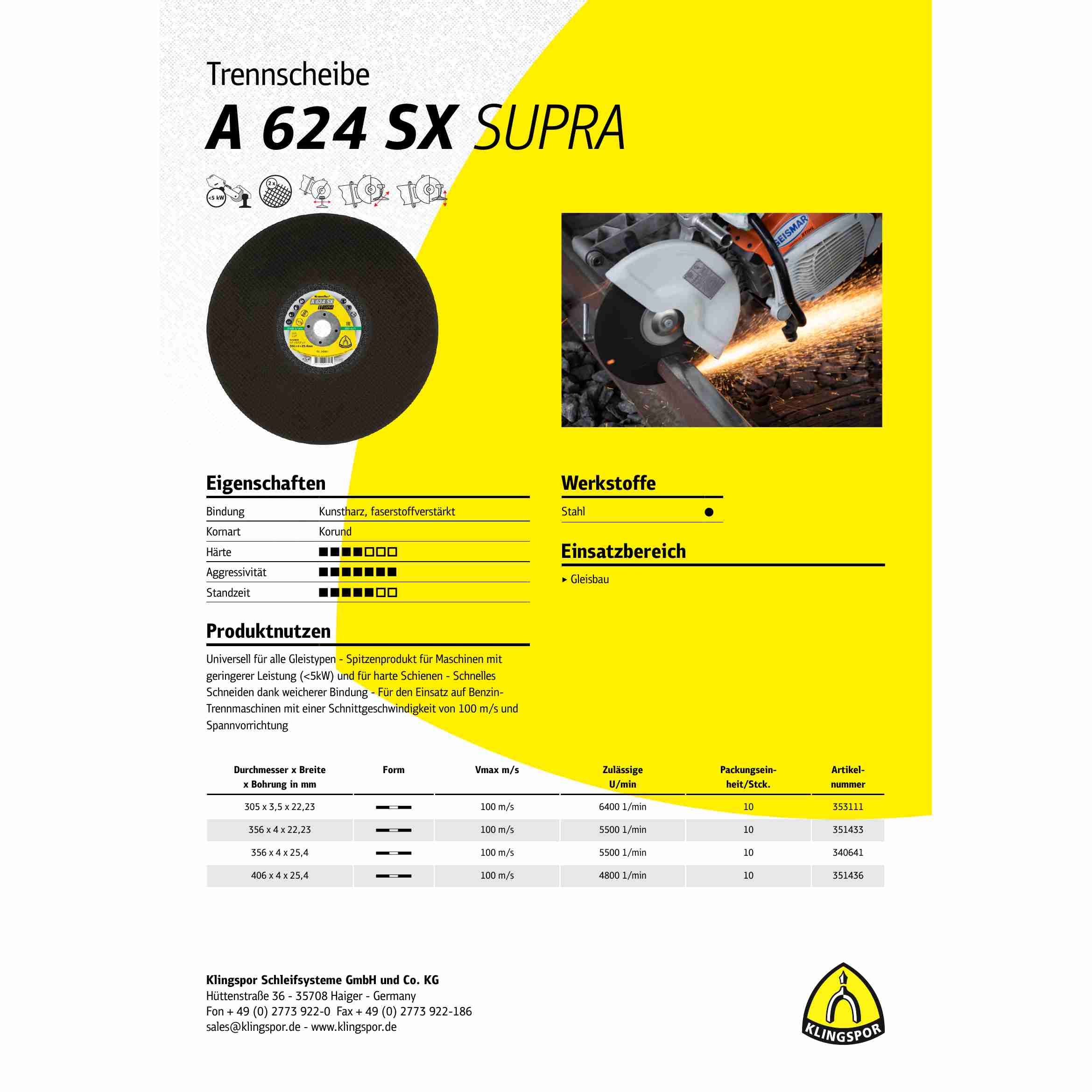 Dank ihrer weicheren Bindung ermöglichen die Klingspor A 624 SX Großtrennscheiben ein schnelles Schneiden. Sie sind speziell für den Einsatz auf Benzin-Trennmaschinen mit einer Schnittgeschwindigkeit von 100 m/s und Spannvorrichtung entwickelt worden.