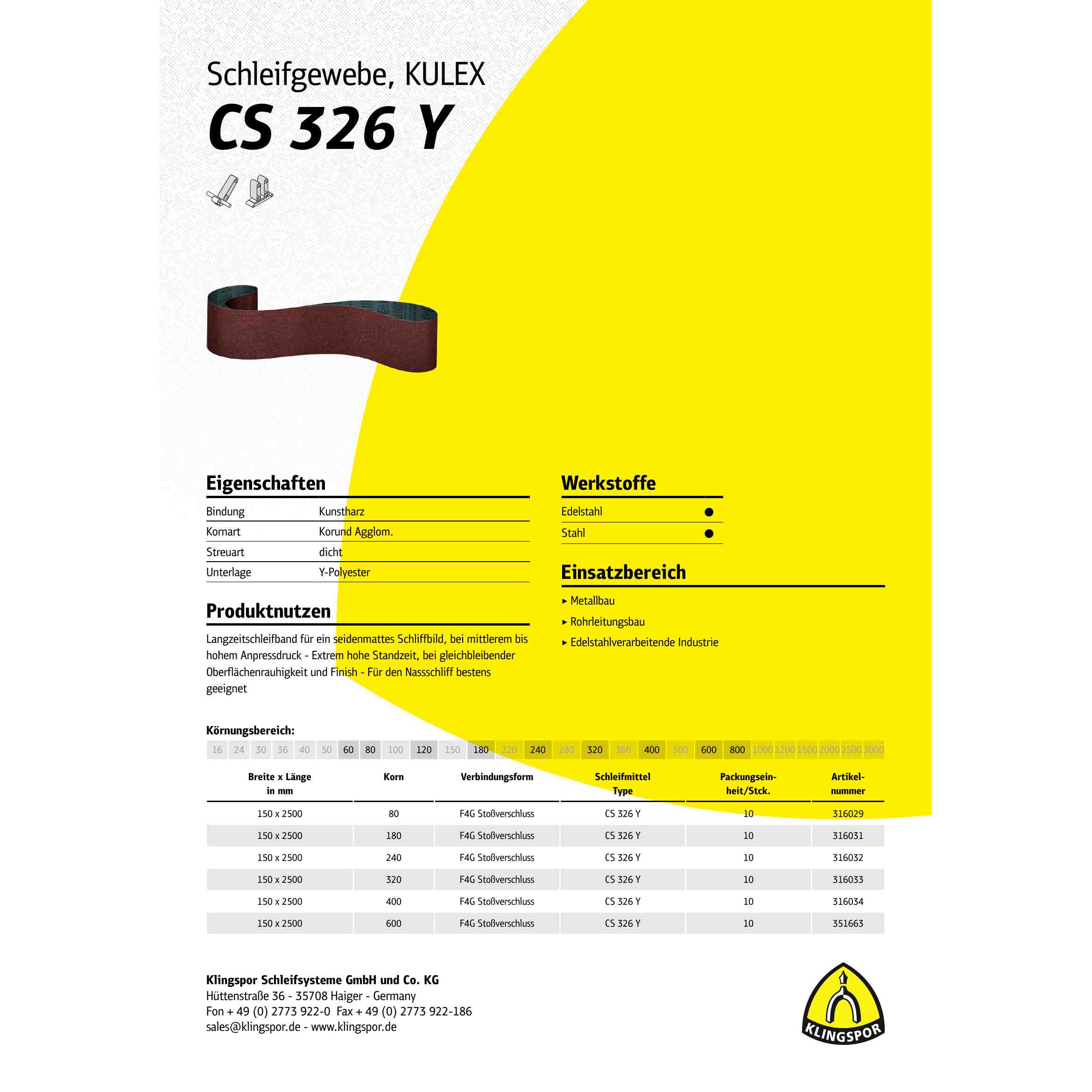 10 x Klingspor CS 326 Y Schleifbänder | 150 x 2500 mm | Korn 80 F4G