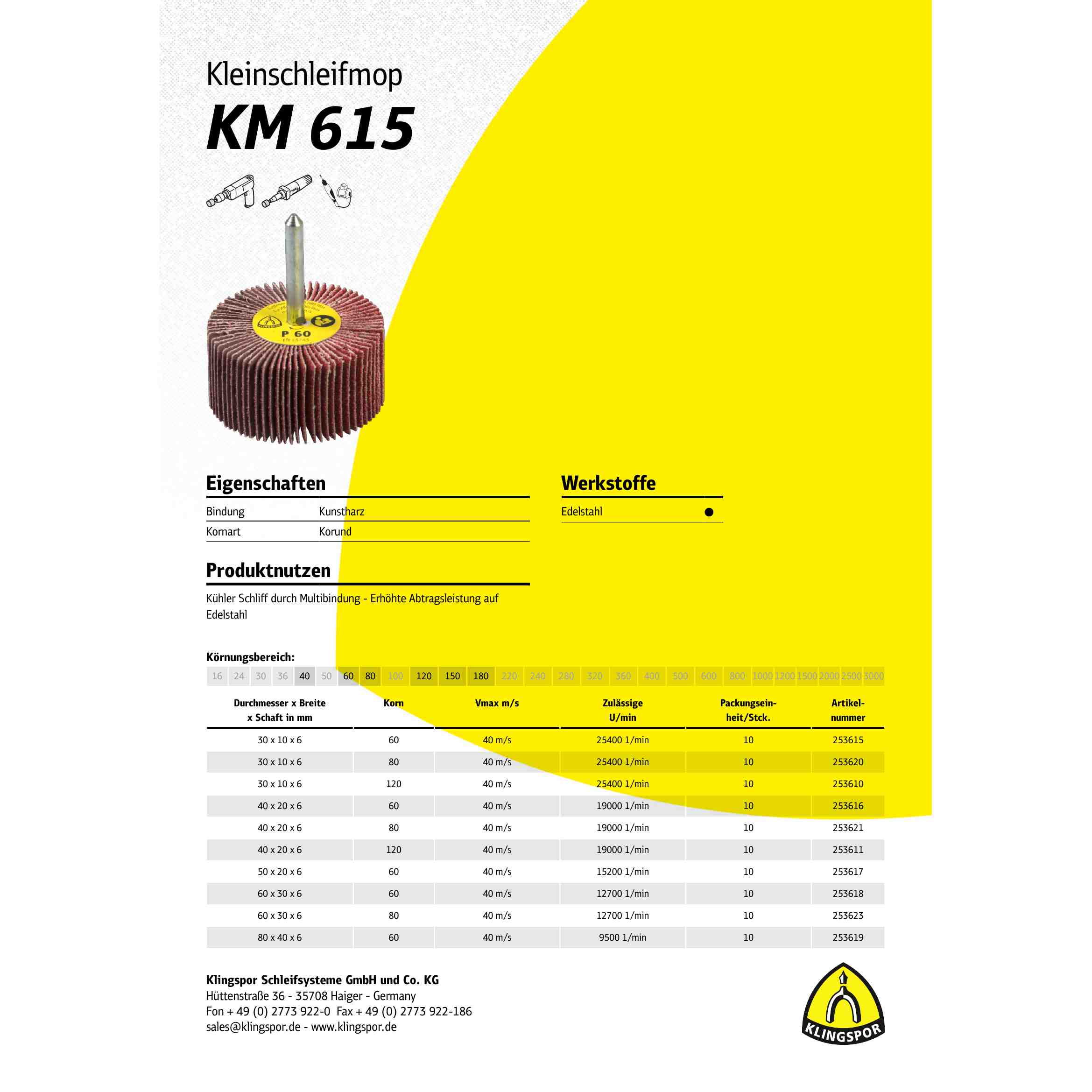 10 x Klingspor KM 615 Schleifmopstifte Multibindung, 60 x 30 x 6 mm Korn 80