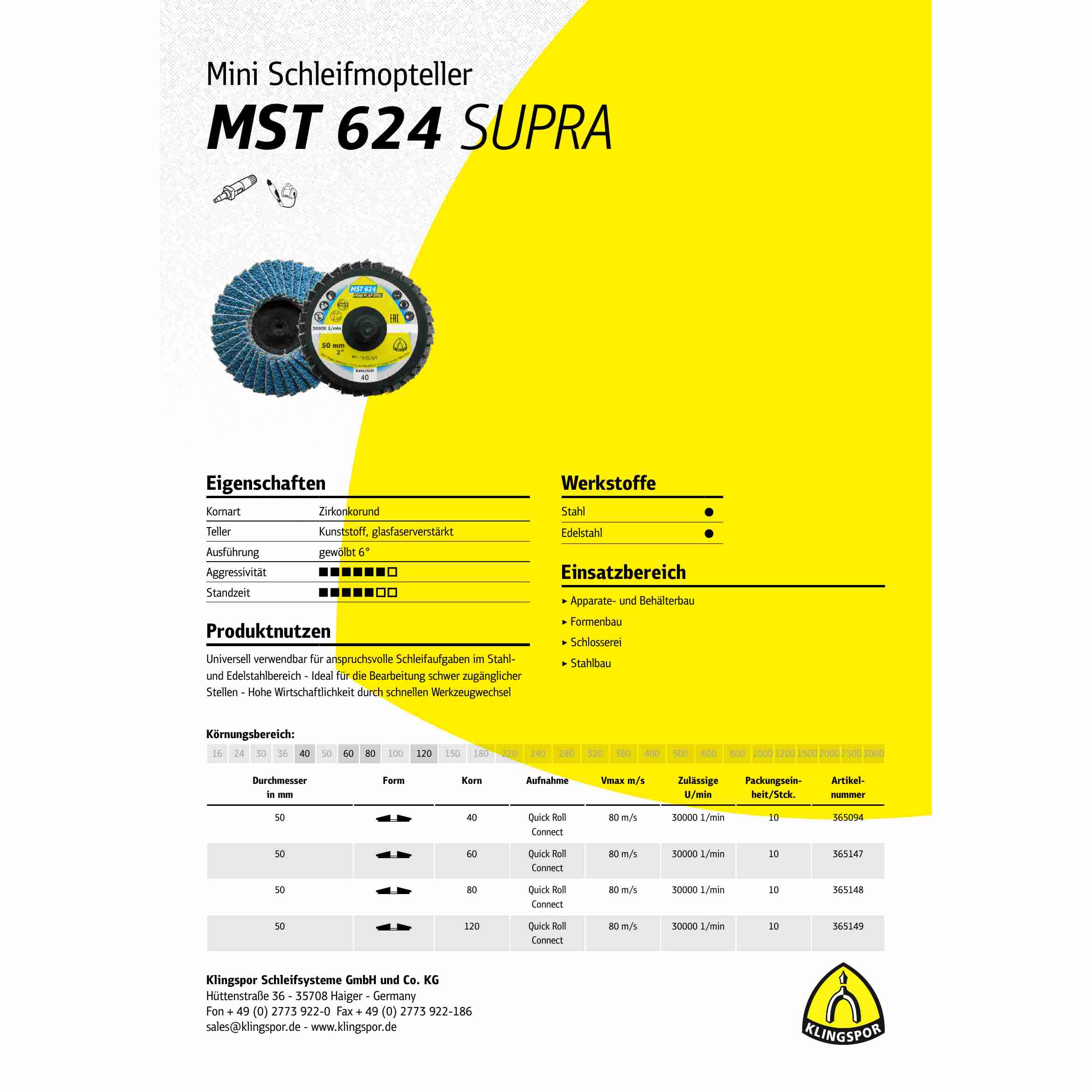10 x Klingspor MST 624 Schleifmopteller Korn 60 50 mm gewölbt Quick Roll Connect