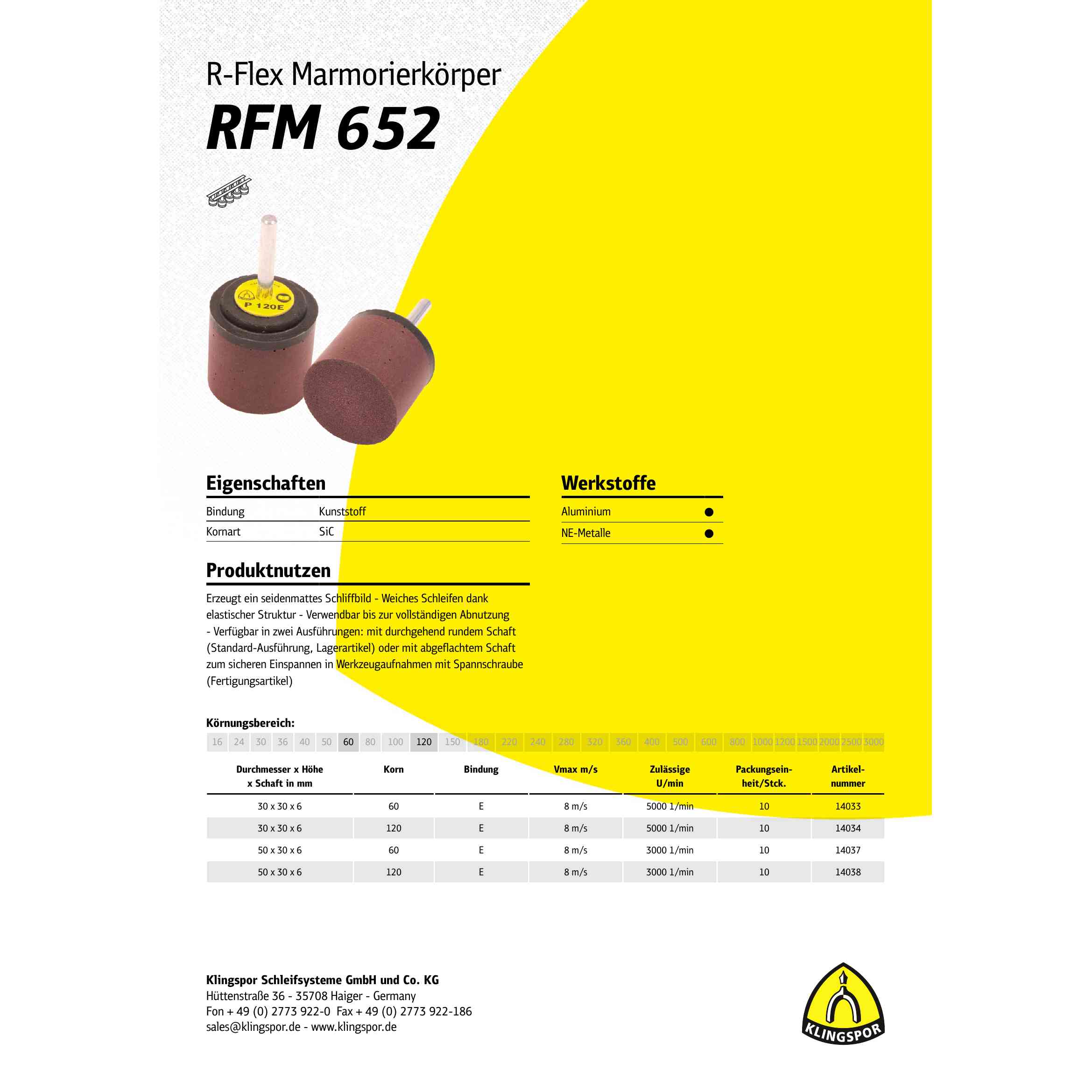 Merkmale: Die Klingspor RFM 652 R-Flex M.-Stifte mit SiC-Schleifkorn und einer Größe von 50x30x6mm bieten eine hohe Präzision und Effizienz bei der Bearbeitung von Aluminium- und NE-Metall-Oberflächen
