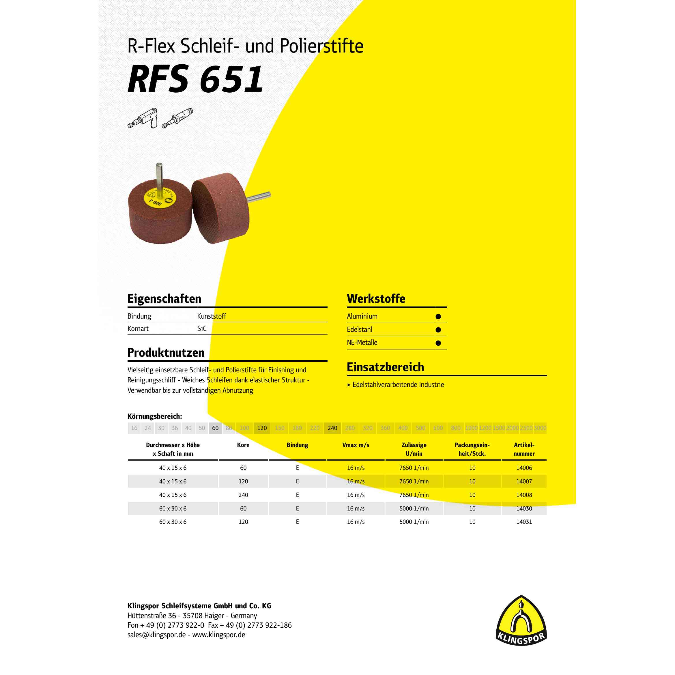 Eigenschaften: Die RFS 651 R-Flex S.-Stifte von Klingspor sind ein unverzichtbares Werkzeug für das Finishing und den Reinigungsschliff bei Aluminium, Edelstahl und NE-Metallen. Dieser vielseitige Schleif