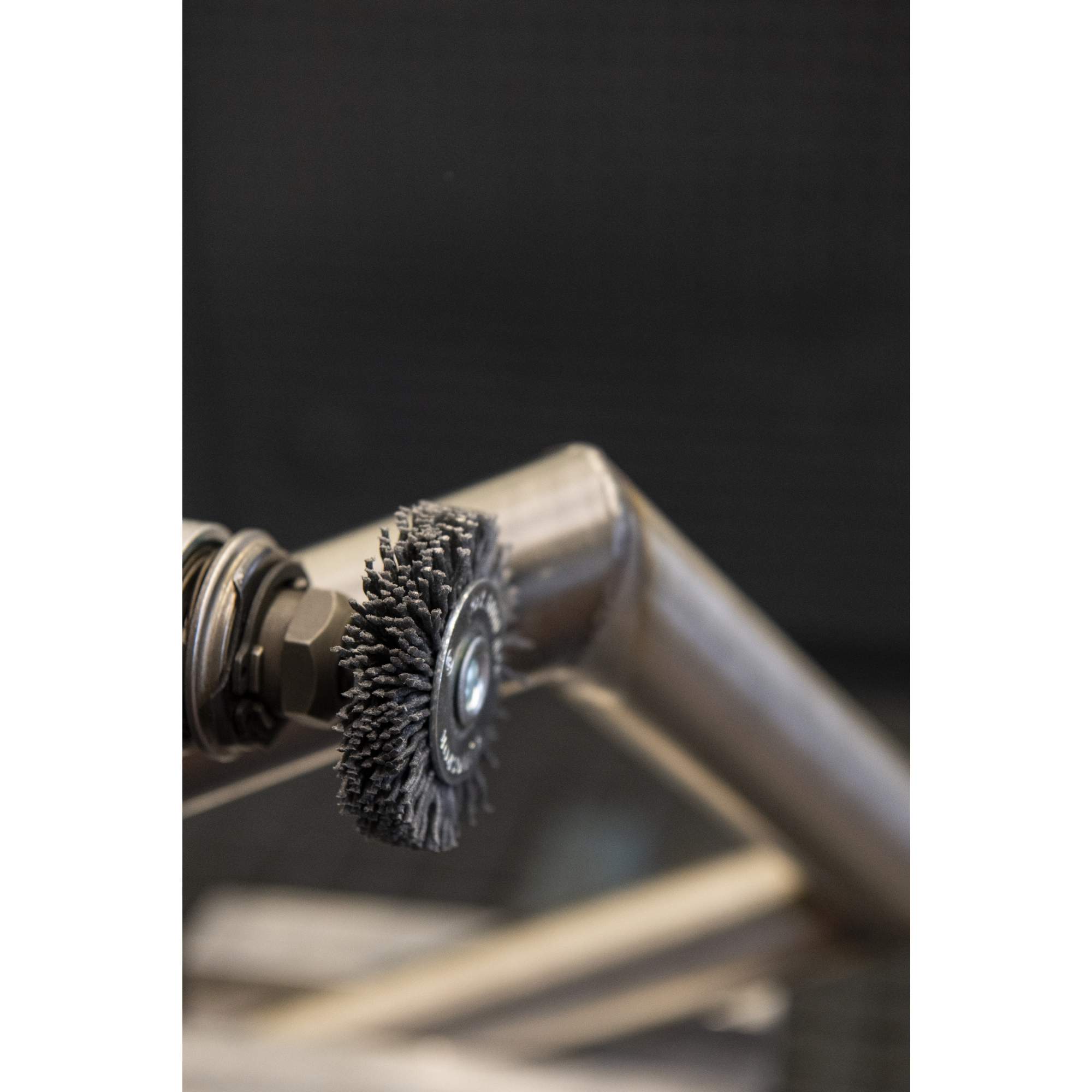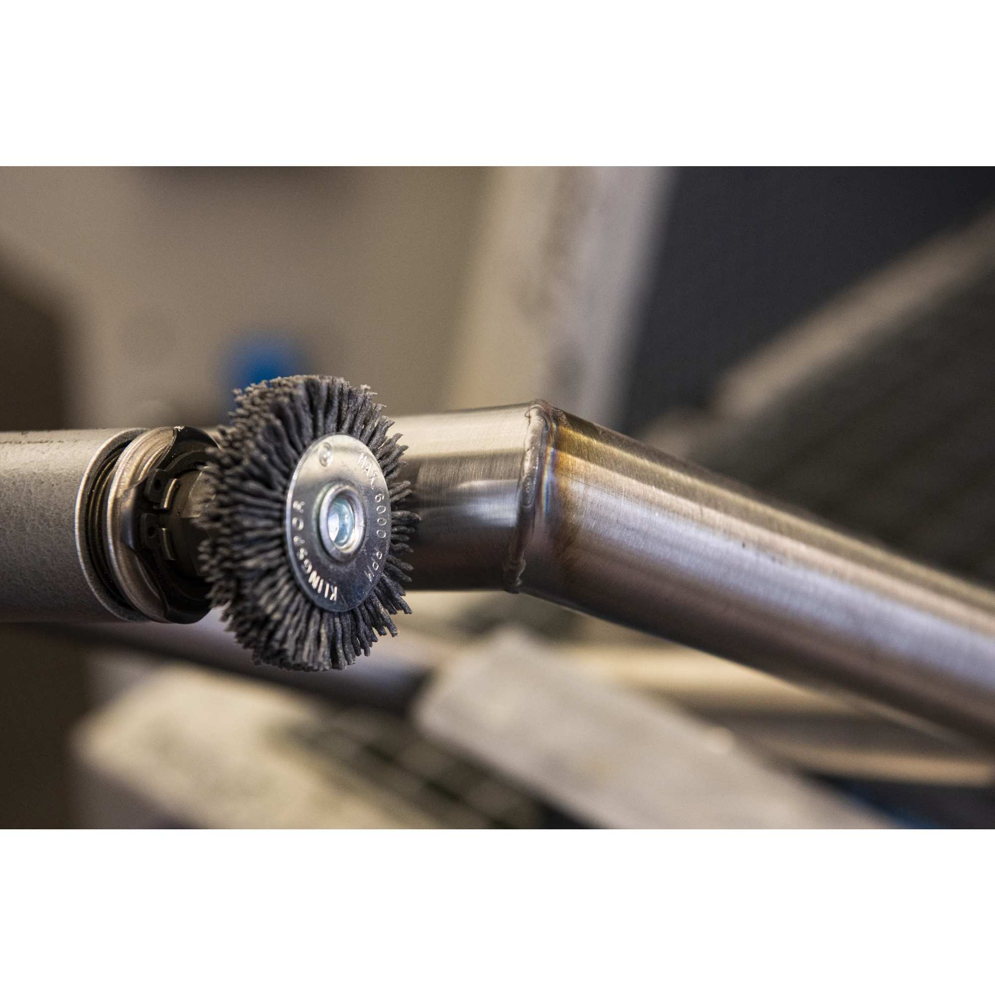 Vorteile: Schleifborsten aus Polyamid mit Silizium Korn durchsetzt für arbeiten mit leichtem Anpressdruck - Ideal zum Strukturieren und Entlacken von Holzbauteilen - Entfernen von Oxidschichten an NE-Metallen oder von Anlauffarben an Edelstahlbauteilen, z. B. Füllstäbe an Edelstahlgeländern
