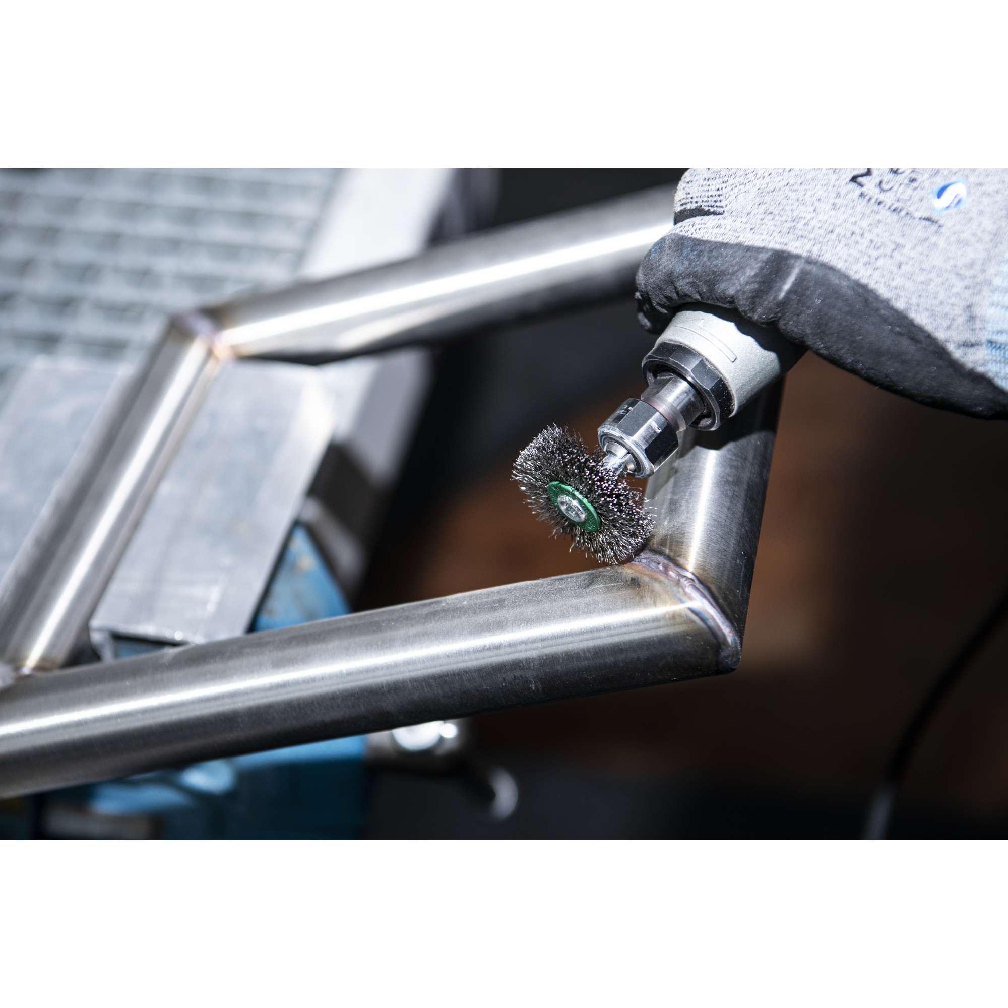 Vorteile: Gewellte Drahtausführung für materialschonendes Reinigen und Säubern von kleinen bis mittleren Oberflächen - Hervorragend geeignet für Bauteile mit erschwertem Zugang wie Sicken und Bördelkanten - Gute Bürstleistung auch bei profilierten Werkstücken