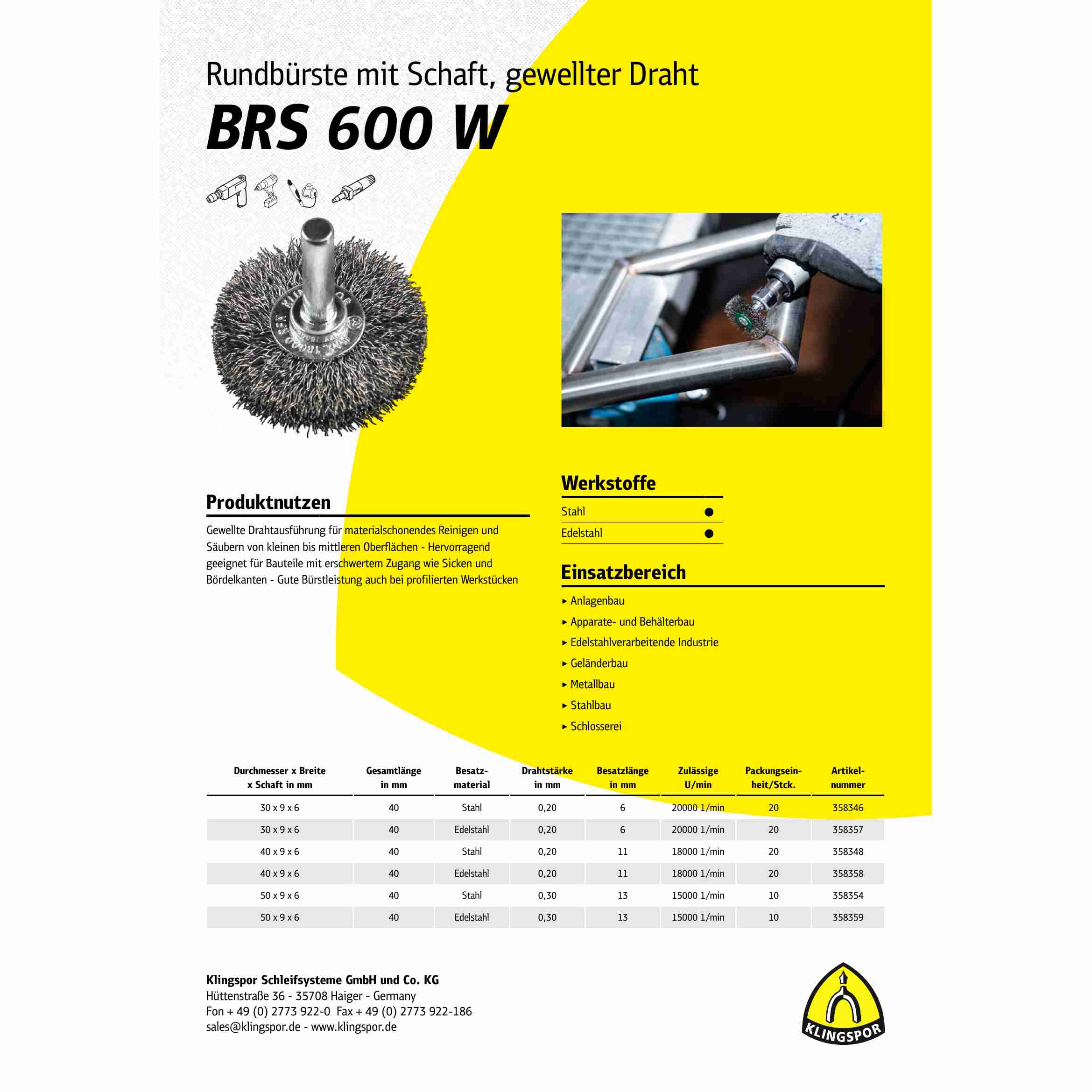 10 x Klingspor Schaftrundbürste 600 W, 60 x 14 x 6 mm, 0,3 Stahl
