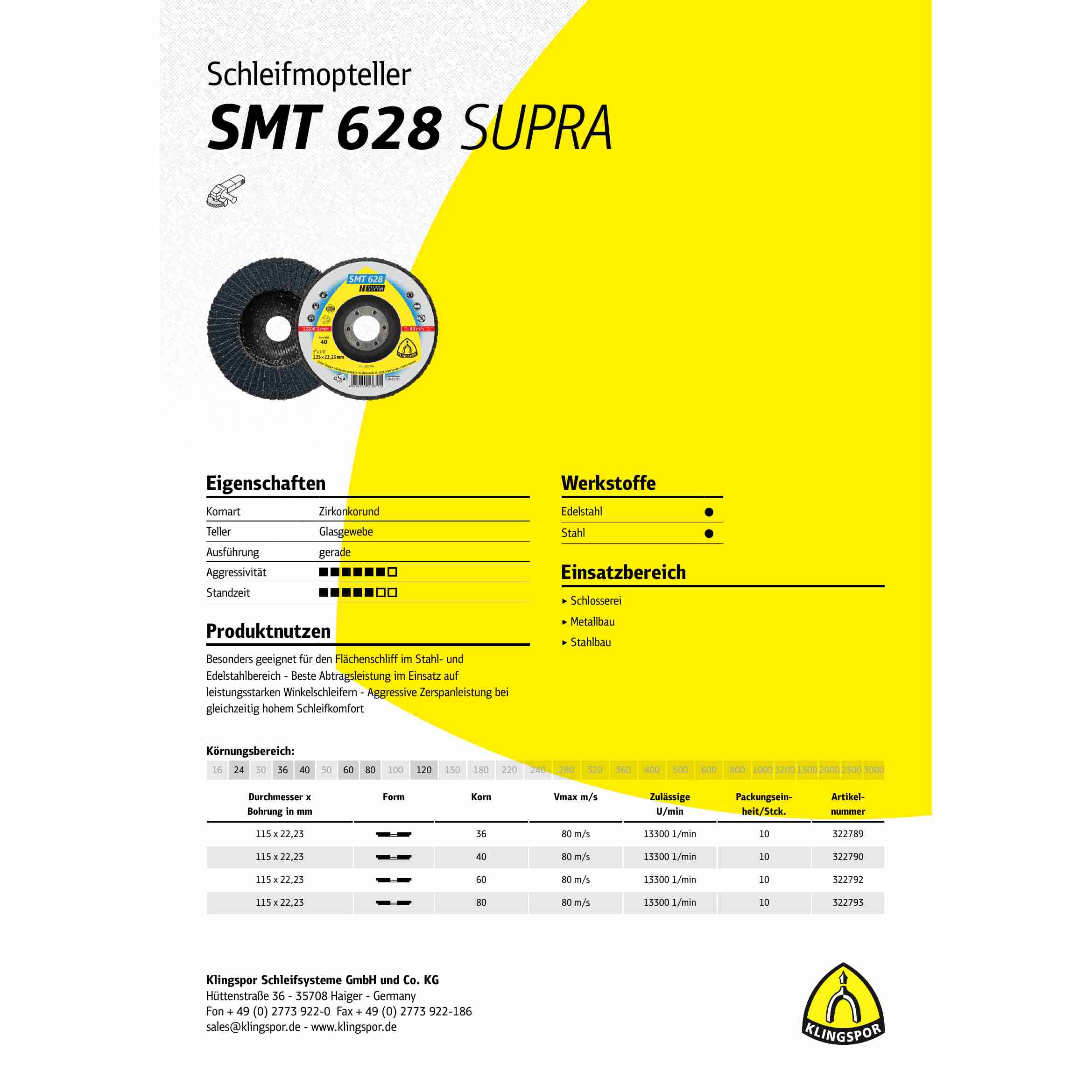 Besonderheiten: Der Klingspor SMT 628 Schleifmopteller überzeugt mit einem aggressiven Zirkonkorund-Schleifkorn, das eine hohe Abtragleistung und lange Standzeiten garantiert