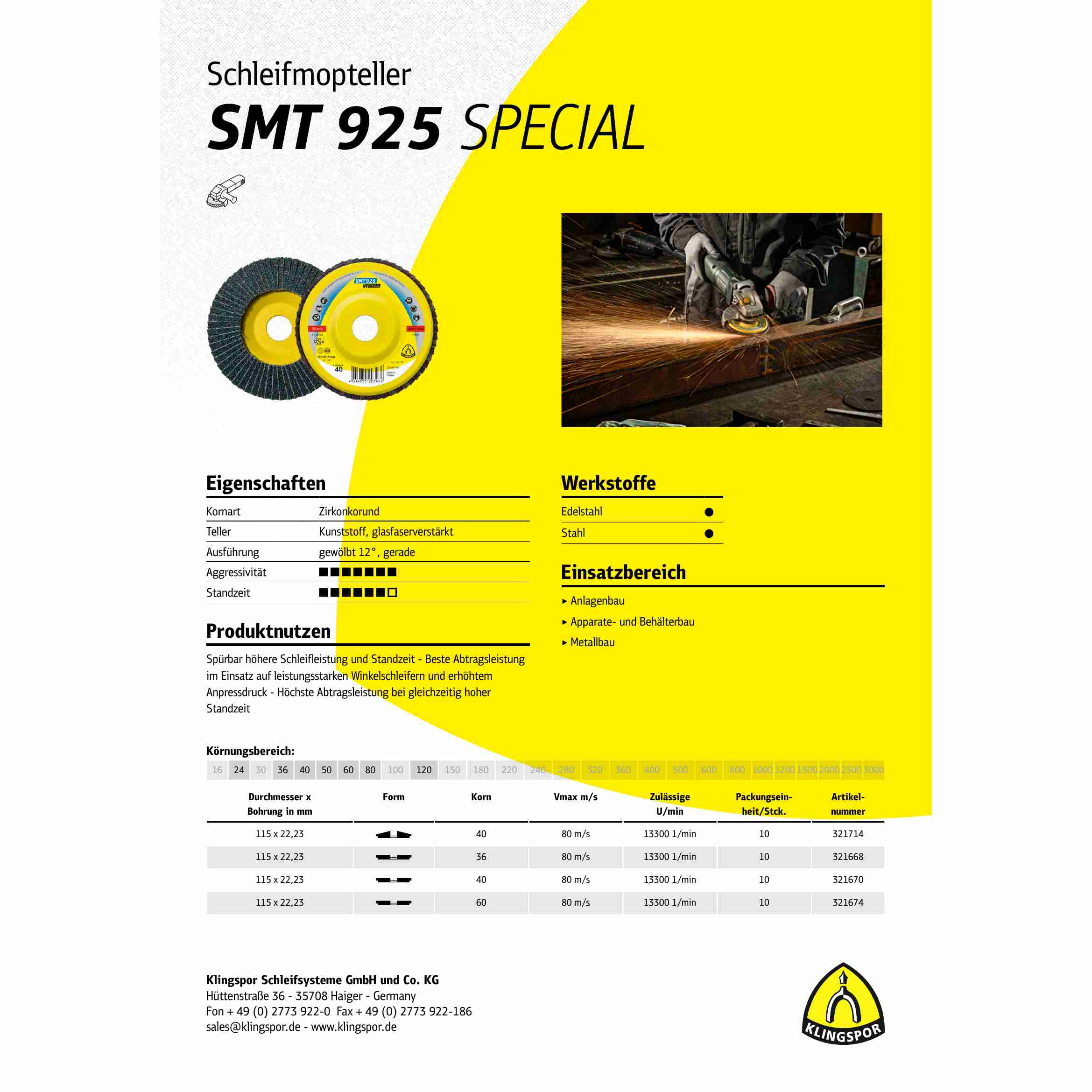 Besonderheiten: Der Klingspor SMT 925 Schleifmopteller punktet mit seinem Zirkonkorund-Schleifkorn und glasfaserverstärktem Kunststoffteller, was ihn ideal für Edelstahl und Stahl macht