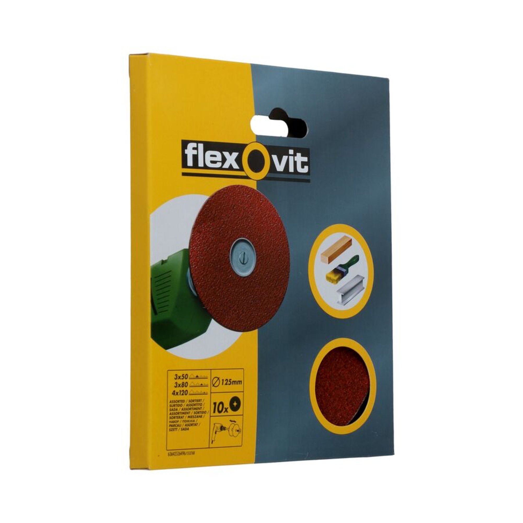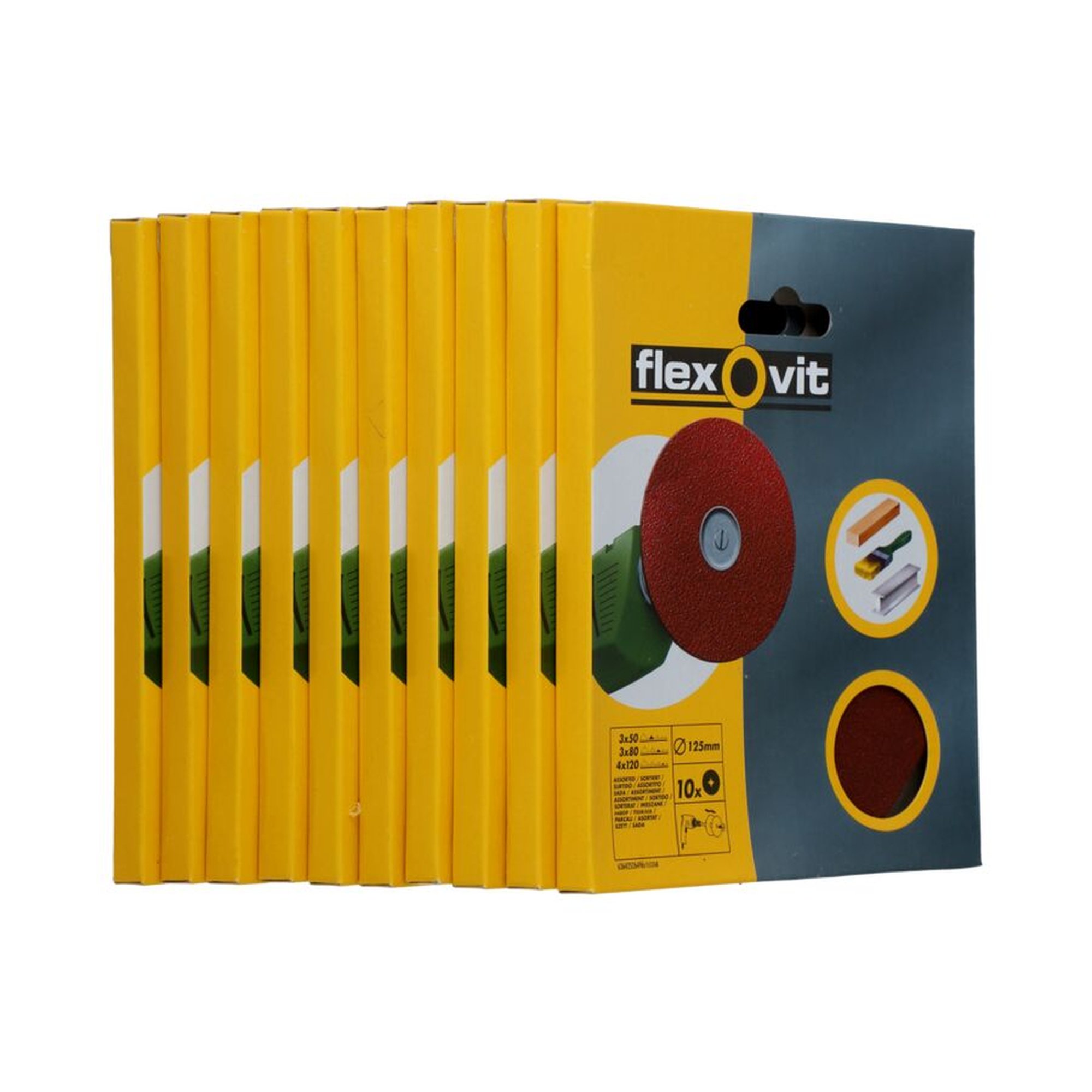 10 hochwertige Flexovit Schleifscheiben (125 mm) für effizientes Schleifen von Metallen, Lacken, Holz und mehr in jeder Verkaufsumgebung.,