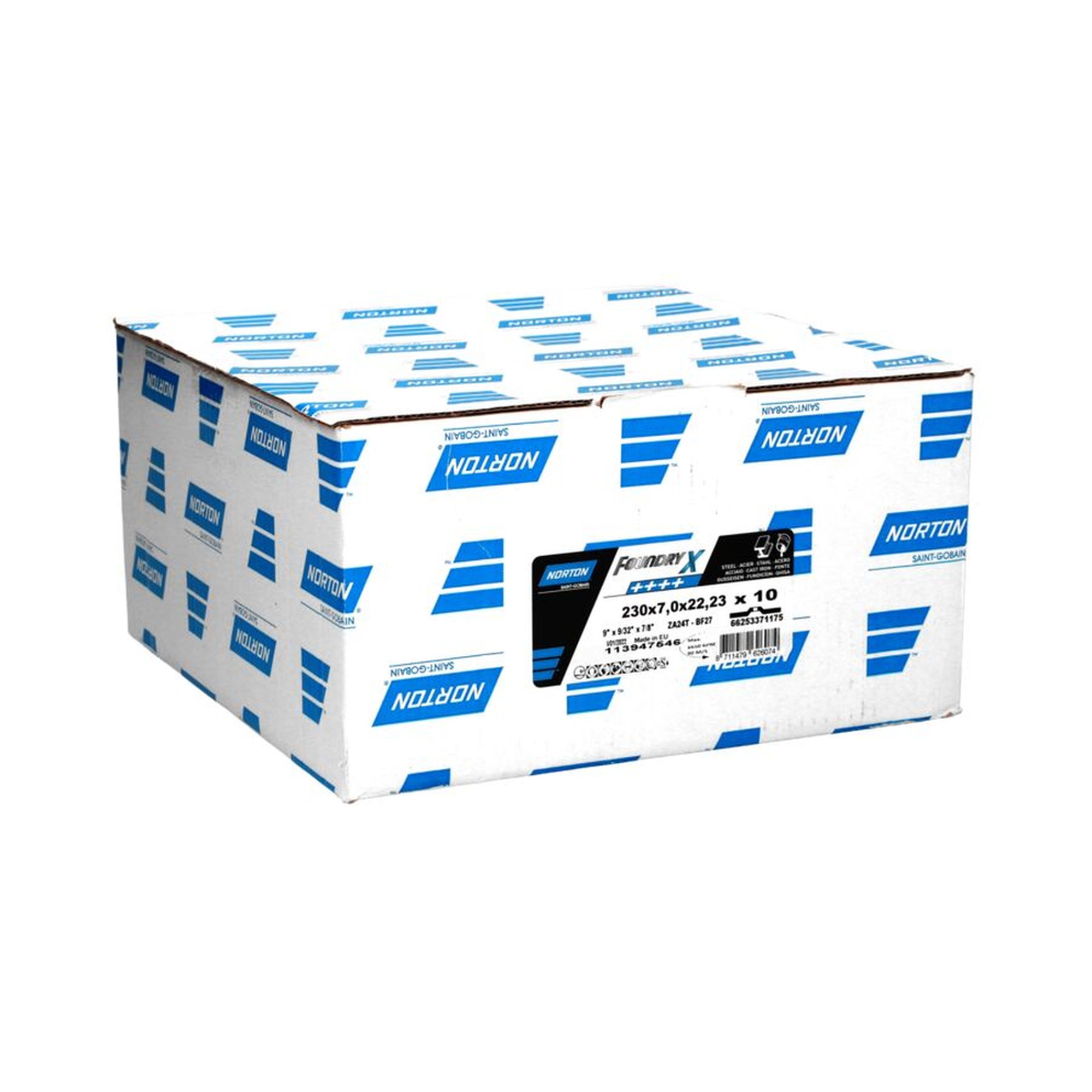 Die 10x NORTON Schruppscheibe gekröpft | HF* 230x7,0x22,23 ZA 24 T Longlife Norzon Foundry X sind speziell entwickelte Schleifscheiben von Norton. Sie bieten eine perfekte Balance zwischen Materialabtrag und Lebensdauer der Scheiben. Dank ihrer groben Körnung und Zirkonia Körner ermöglichen sie eine hohe Metallabtragsrate. Diese Schleifscheiben wurden speziell für Hochfrequenz-Schleifmaschinen entwickelt, die im professionellen Markt für grobe Anwendungen in den anspruchsvollsten Umgebungen eingesetzt werden.