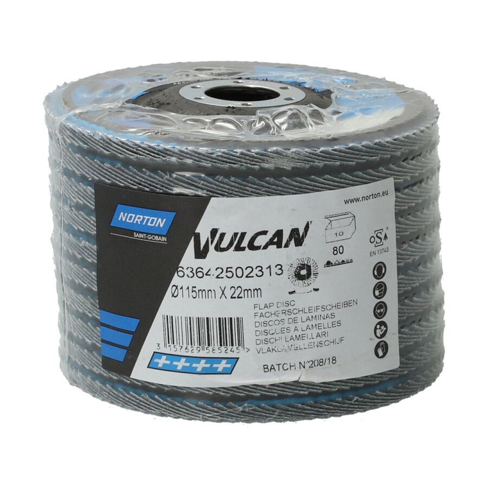 Die NORTON Fächerscheibe Schleifmopteller | 115x22 R842 80 Vulcan sind in einer praktischen Packung mit 10 Stück erhältlich. Jede Scheibe hat einen Durchmesser von 115 mm und eine Bohrung von 22 mm. Mit einer Körnung von 80 sind sie ideal für grobe Schleifarbeiten geeignet.