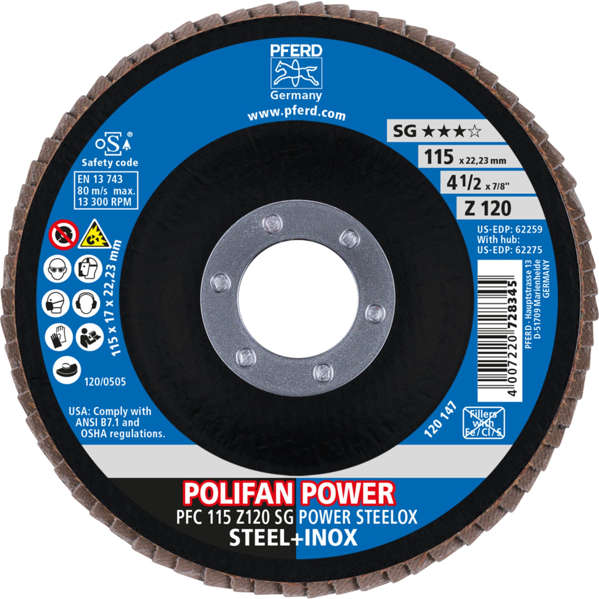 Die PFERD POLIFAN-Fächerscheibe PFC 115 Z 120 SG POWER STEELOX ist mit einem Durchmesser von 115 mm und einer Körnung von 120 erhältlich. Sie ist kompatibel mit handelsüblichen Winkelschleifern und lässt sich einfach und schnell montieren.
