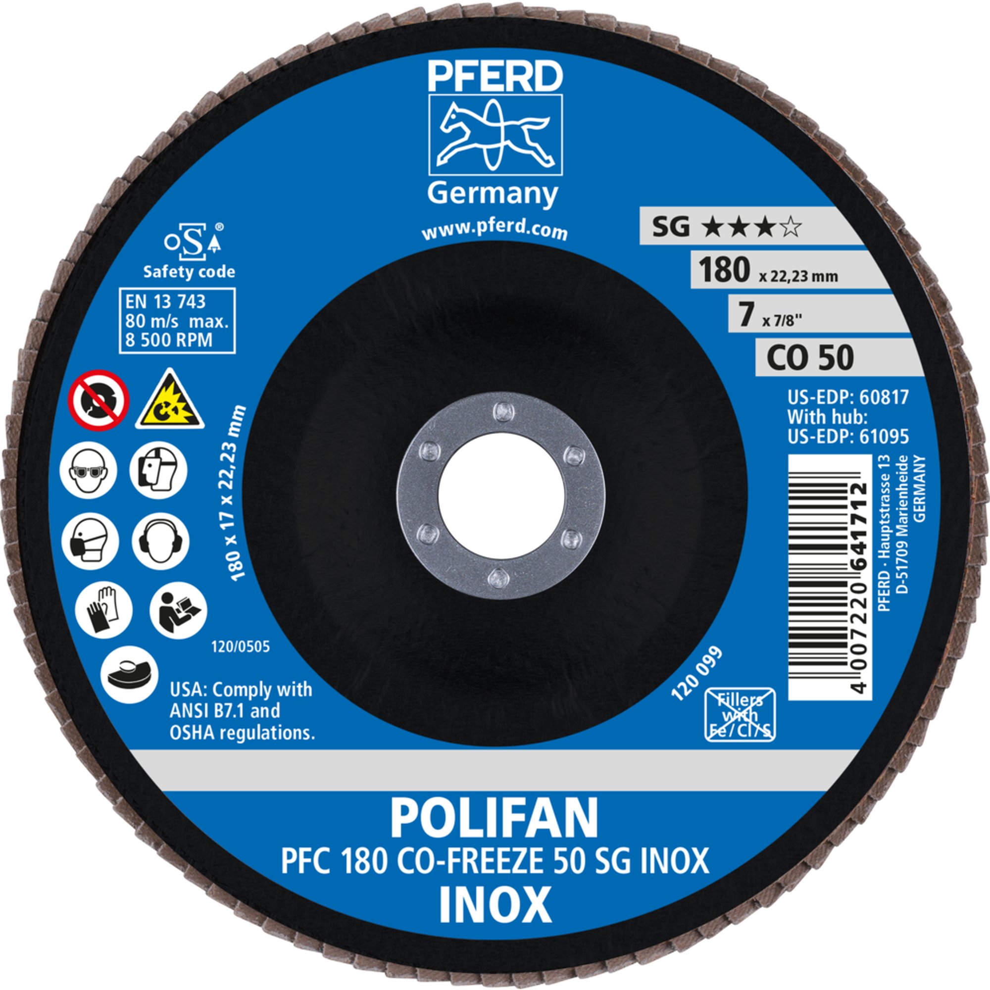 Die PFERD POLIFAN-Fächerscheibe PFC 180 CO-FREEZE 50 SG INOX ist einfach zu handhaben und bietet eine hohe Schleifleistung. Sie ist in der Lage, auch bei hohen Belastungen eine gleichbleibende Schleifqualität zu liefern.