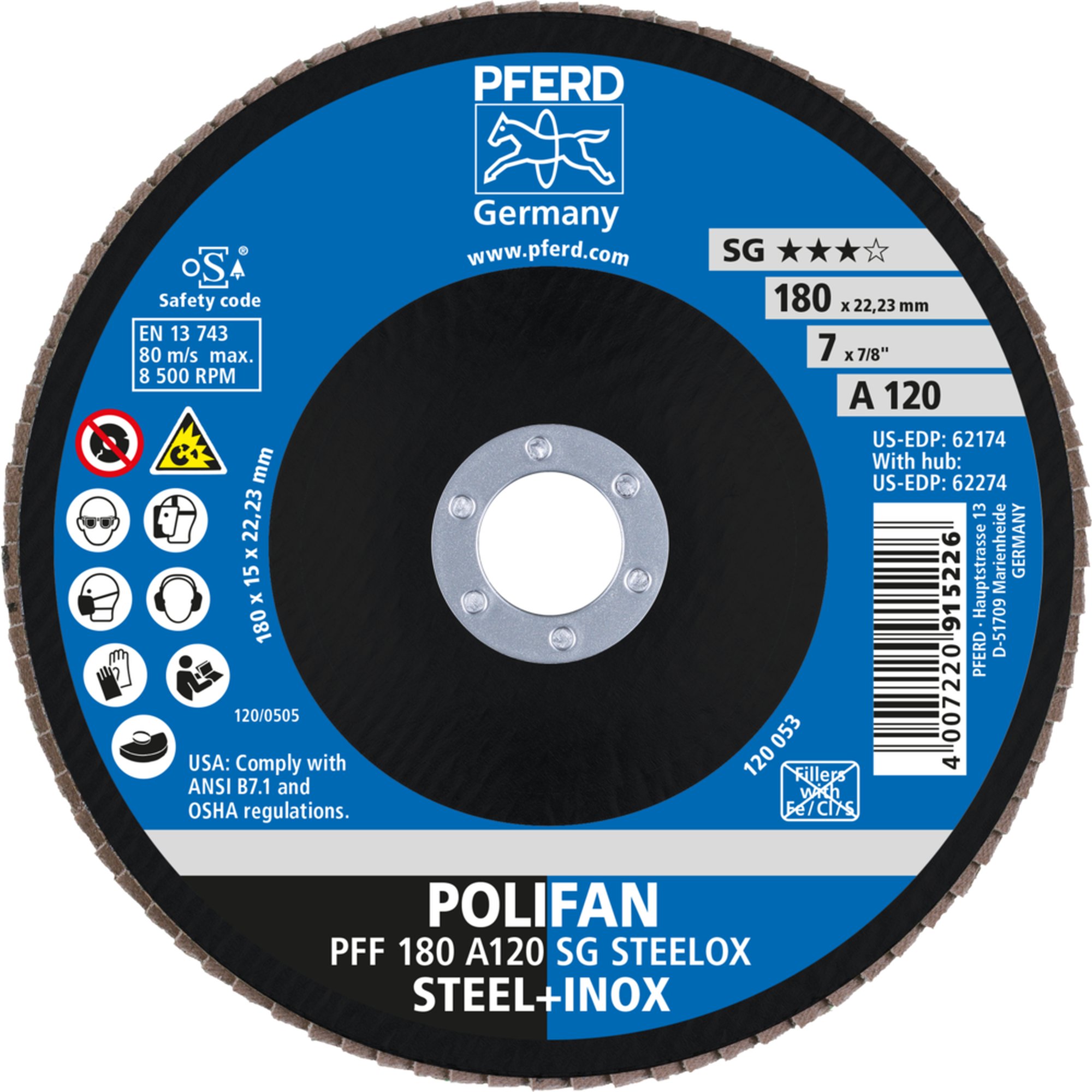 Besonderheiten: Hochwertige PFERD POLIFAN-Fächerscheibe PFF 180 A 120 SG STEELOX mit beeindruckender Zerspanungsleistung und außergewöhnlich langer Standzeit. Ideal für schnelles und effizientes Schleifen von Stahl, Edelstahl und Aluminium