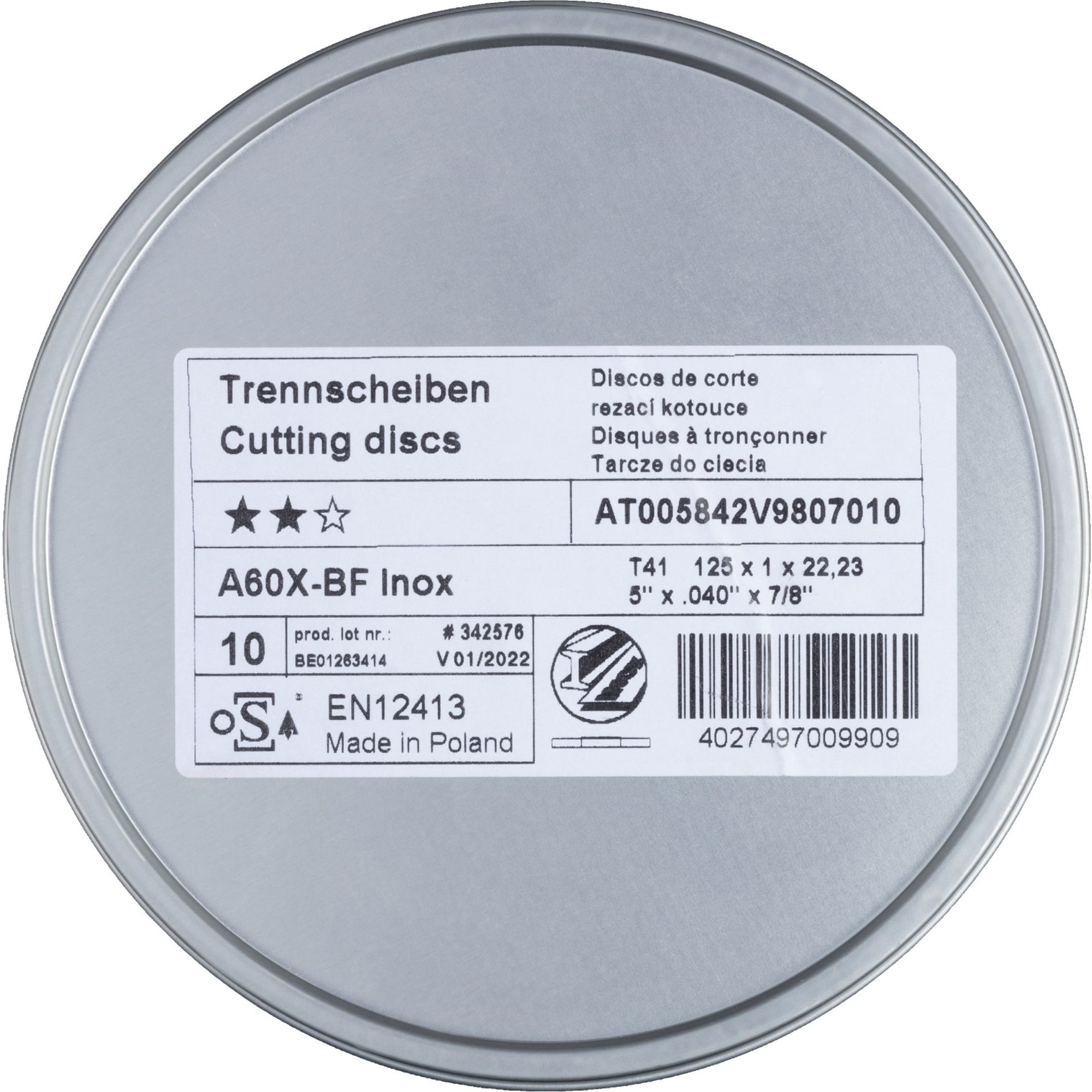 10 x Trennscheiben in Dose T41 für Edelstahl 125x1 mm gerade A60X-BF