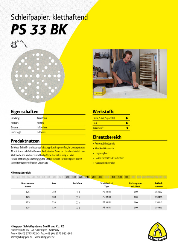 Die Klingspor PS 33 CK Schleifscheiben kombinieren einen robusten Korundkorn mit halboffener Streuung auf flexiblem C-Papier. Eine zusätzliche Stearat-Beschichtung minimiert das Zusetzen durch Lack- und Harzpartikel und sorgt für sauberes Arbeiten. Die vollflächige Klettbeschichtung ermöglicht eine sichere Befestigung auf Exzenter- und Rotationsschleifern und einen schnellen Wechsel. PS 33 CK eignet sich besonders für Zwischen- und Endschliffe an Lacken, Farben, Spachteln, Füllern und Holz - perfekt für Maler, Lackierer, Tischler und Heimwerker. Viele Körnungen bieten die passende Wahl für jede Schleifaufgabe. Diese Ausführung in Körnung 80 ist für Materialabtrag und Vorschliff. .