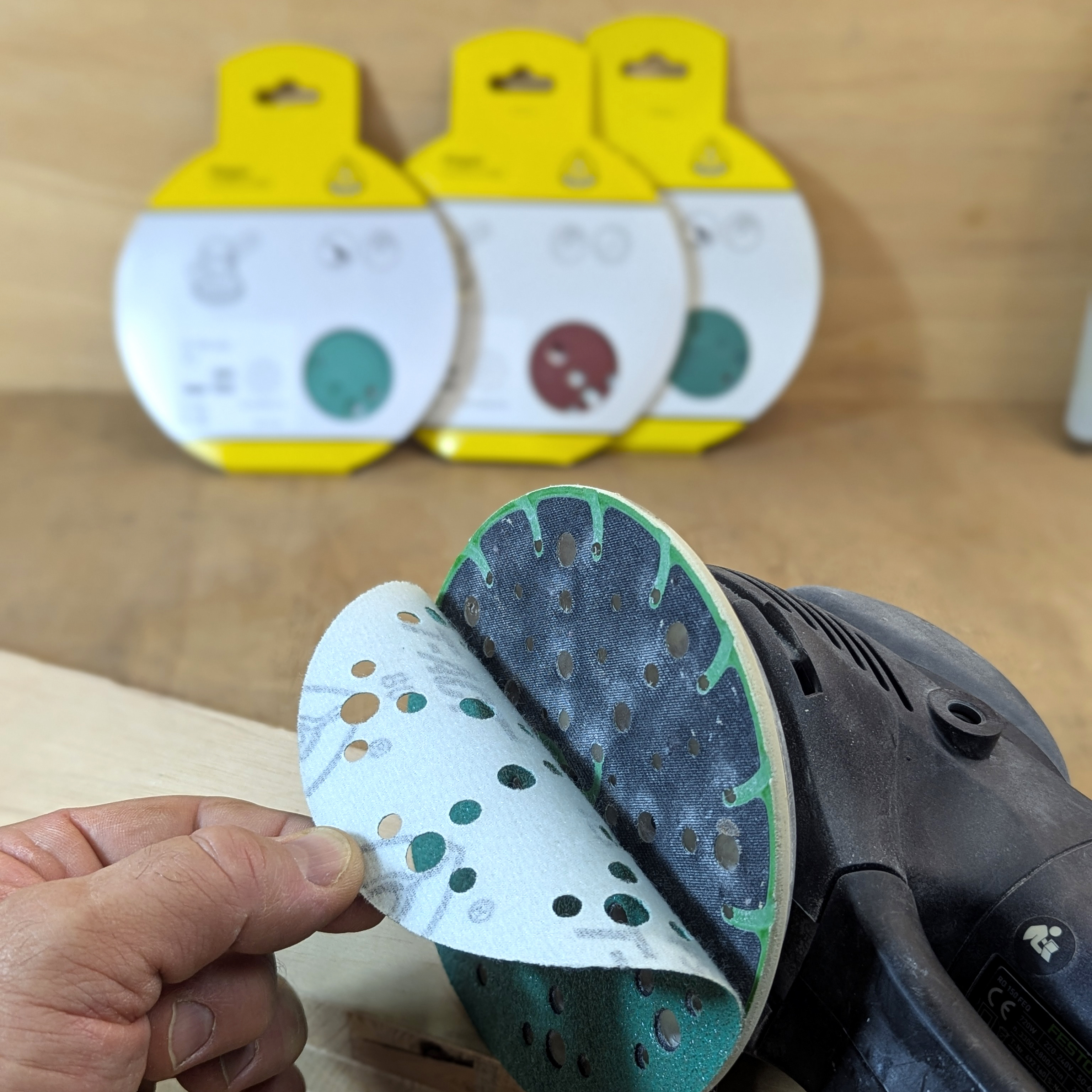 Flexible Korund-Schleifscheiben mit halboffener Streuung und Stearat-Beschichtung - ideal für Lack, Farbe, Spachtel und Holz; C-Papier mit Klettbefestigung.