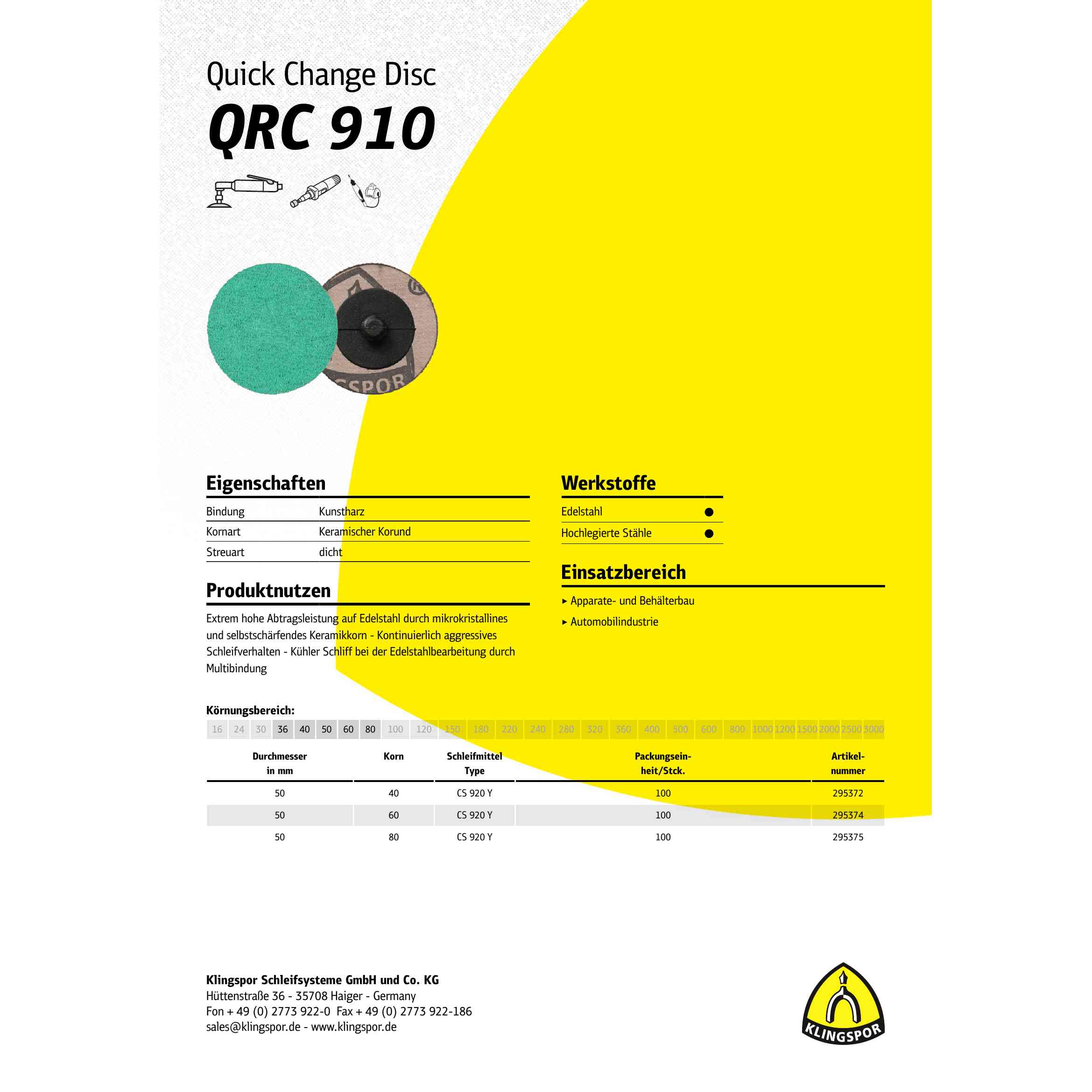 Merkmale: Die Klingspor QRC 910 Quick change discs bieten eine extrem hohe Abtragsleistung für die Edelstahlbearbeitung. Das Geheimnis hinter dieser Leistung liegt in ihrem hochscharfen keramischen Korund