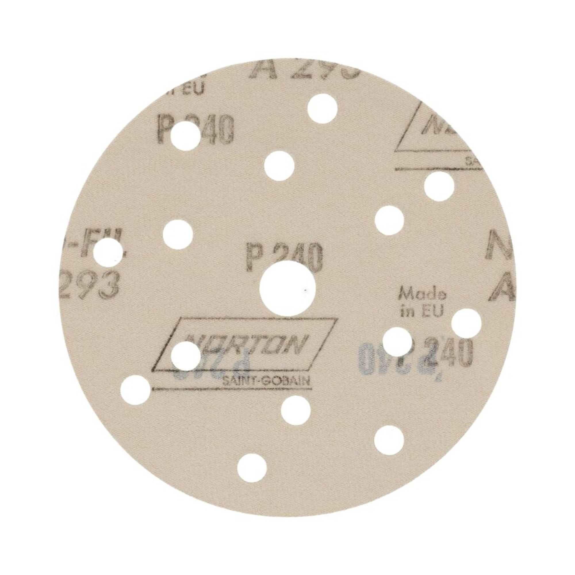 Das hochwertige Aluminiumoxidkorn der Norton A293 sorgt für eine ausgezeichnete Schleifperformance. Die No-Fil®-Beschichtung und die robuste Papierunterlage erhöhen die Widerstandsfähigkeit gegen Verstopfen, was die Lebensdauer der Scheiben signifikant verlängert. Die Scheiben sind für den Einsatz auf Tellerschleifern ideal geeignet und verfügen über ein 14+1-Loch-System, das eine optimale Staubabsaugung während des Schleifprozesses gewährleistet.
