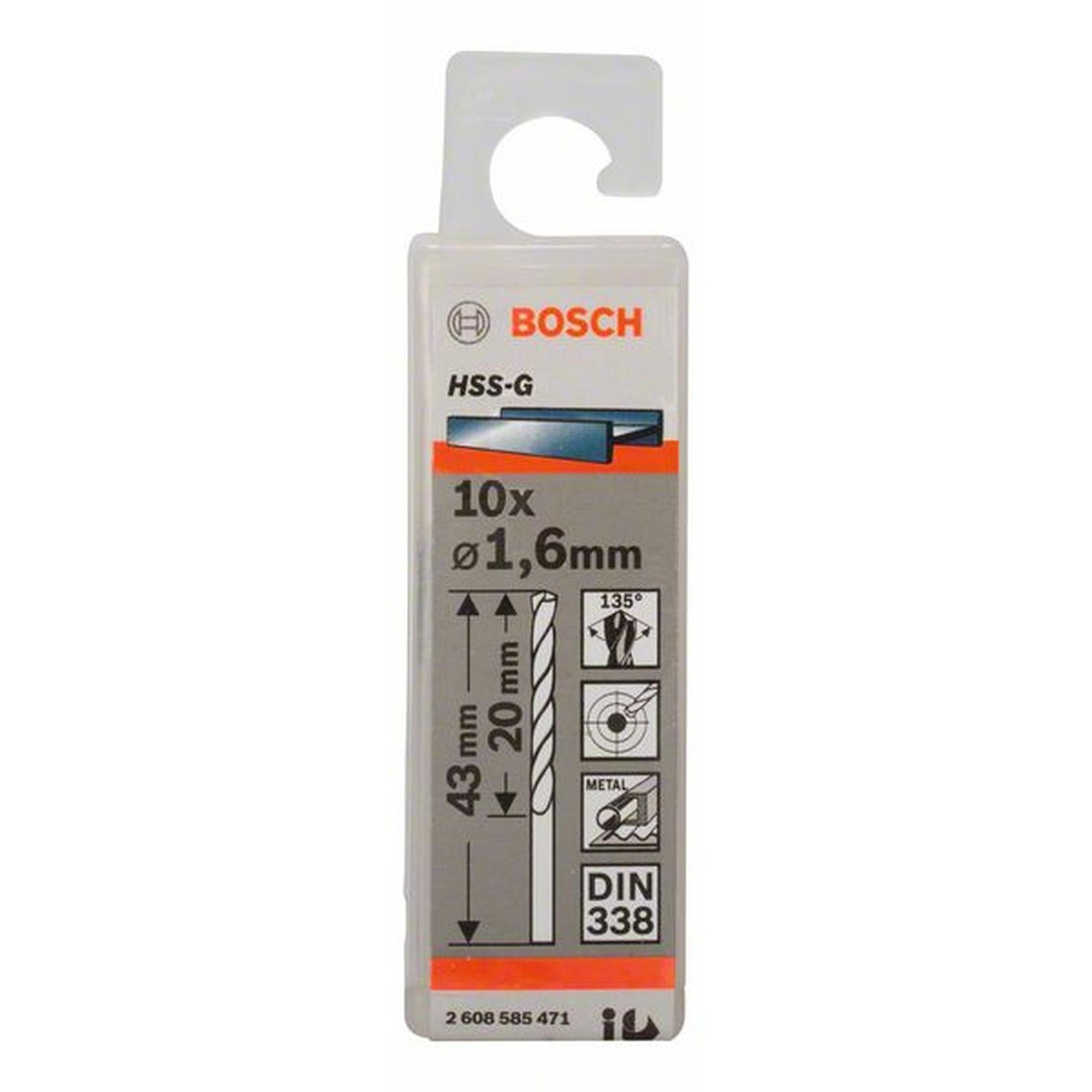 Die Metallbohrer werden nach DIN 338 gefertigt und gehören zum Bohrertyp N mit einem kleinen Seitenspanwinkel und einer Bohrspitze von 135 Grad. Der Durchmesser beträgt 1,6 mm, die Arbeitslänge 20 mm und die Gesamtlänge 43 mm.