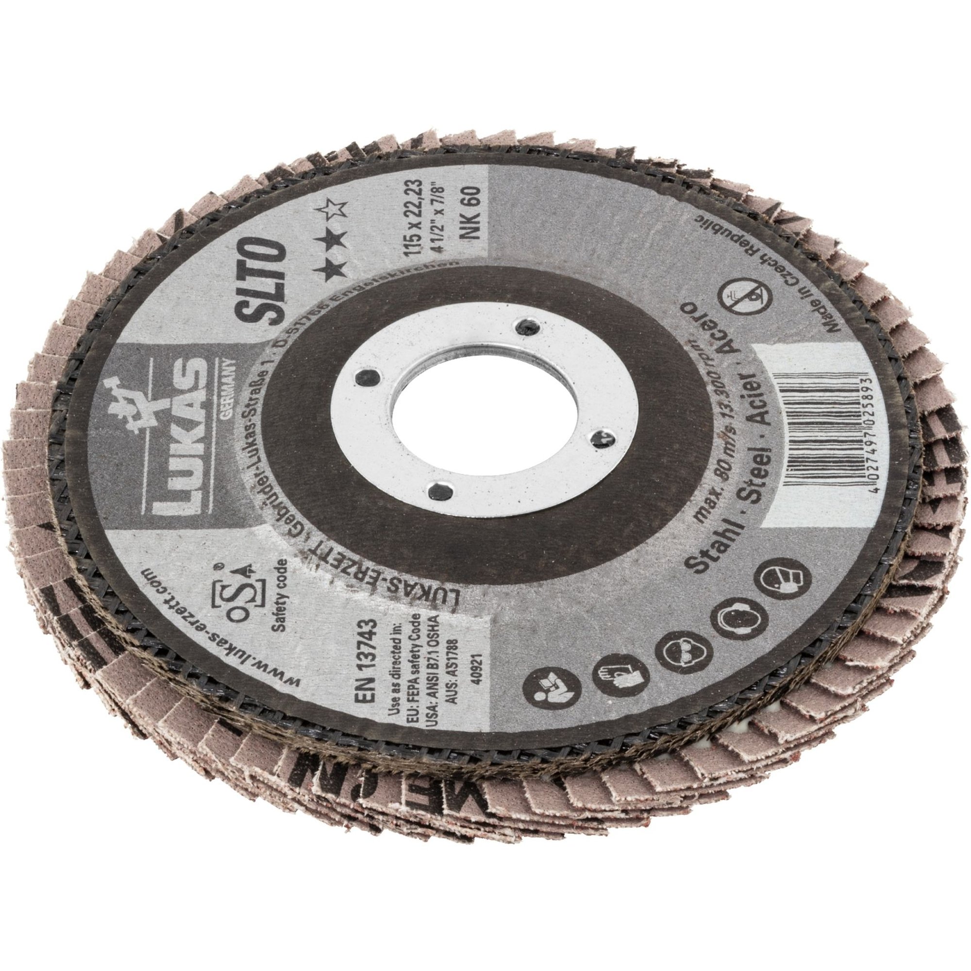 Eigenschaften: Diese hochwertige 10x LUKAS Fächerscheibe Fächerscheiben Schleifscheibe SLTR Ø 125mm Korn 80 bietet ein unschlagbares Preis-Leistungsverhältnis dank ihrer rechteckigen Lamellen und des verwendeten Normalkorunds