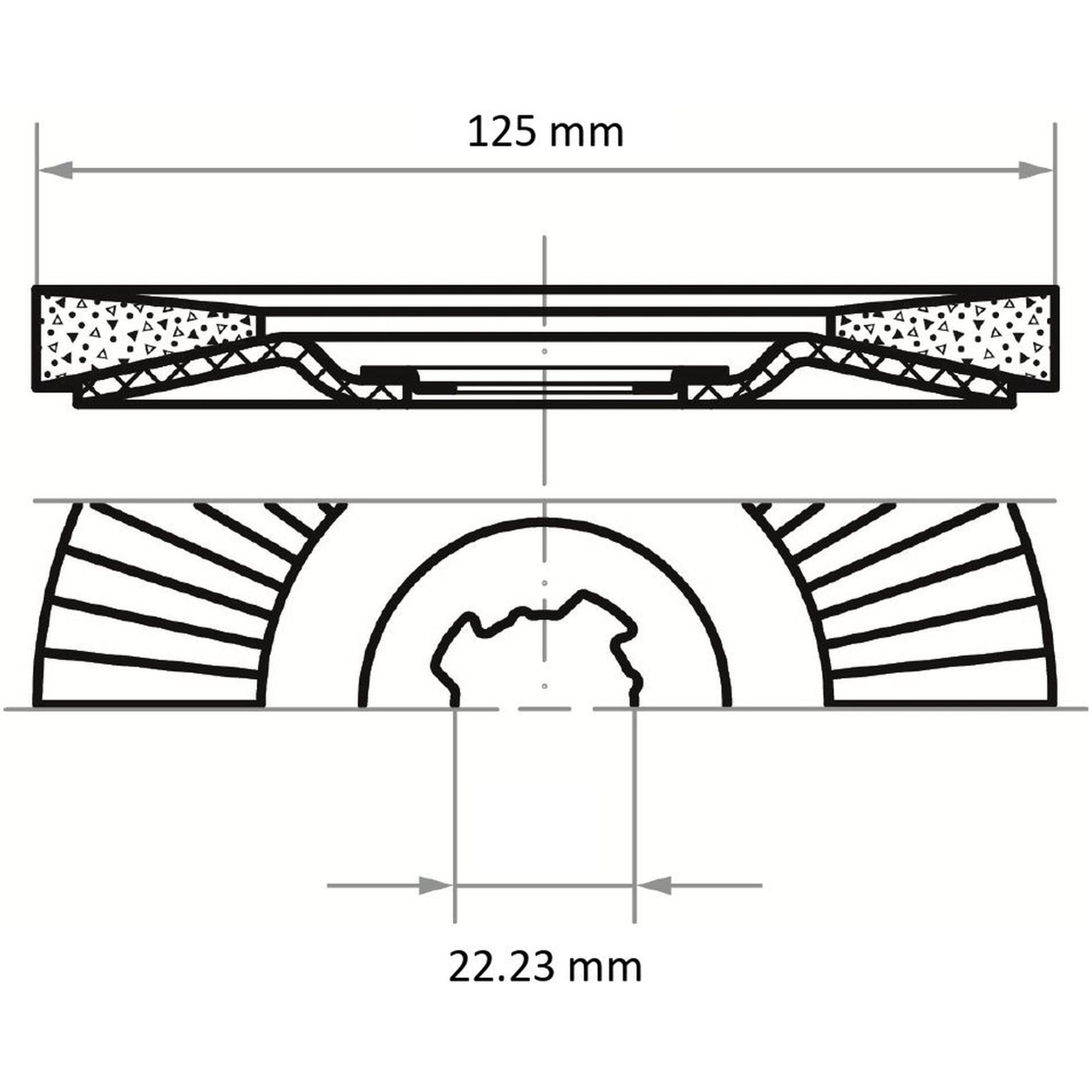 Gehärtete Oberflächen, verschleißfeste Stähle, Zunder- und Hartschichten, Titanlegierungen sowie Panzerschweißnähte stellen kein Problem dar und lassen sich in kurzer Zeit bearbeiten. Der leichte, stabile und elastische Glasgebewebe-Träger des Wekzeugs ermöglicht durch seine Flexibilität ein hervorragendes Oberflächenergebnisse. Die hohe Bruchsicherheit sowie geringe Vibrationen beim Arbeiten und eine leichte Handhabung machen das Werkzeug perfekt. Das Werkzeug ist mit dem neuesten Spannsystem ausgerüstet: der X-Lock-Technologie. Dieses ermöglicht eine schnelle Ein-Klick-Montage mit der Hand ganz ohne Spannschlüssel. Gleichzeitig ist eine hohe Sicherheit beim Arbeiten gewährleistet. Ein ungewolltes Lösen ist nicht möglich. Dank mehrlagigem Schleifbelag ist dieses Werkzeug immer so scharf, wie beim ersten Einsatz. Wenn die oberen Lamellen verschleißen, wird frischer Schleifbelag der darunterliegenden Lamellen freigelegt. So erreicht das Werkzeug eine hohe Lebensdauer und eine gleichbleibende Arbeitsqualität. Die flache Lage der optimal verklebten Sichellamellen ermöglicht nicht nur eine erhöhte Arbeitssicherheit, sie schränkt auch den Verschleiß des Werkzeugs ein. Das Schleifkorn haftet besonders fest in seiner Unterlage und wird optimal genutzt. Im Außenbereich des Werkzeugs befinden sich besonders viele Schleifkörner, was zu einem besonders hohen Abtrag pro Minute führt. Ein hervorrangeder Abtrag ist garantiert. Dank eines hochwertigen Harzsystems reißt dieses Werkzeug auch bei hohen Drehzahlen oder Arbeitstemperaturen nicht. Zusätzlich wird bei der Herstellung auf Umweltschutz geachtet und modernste Technologien mit kurzen Aushärtezeiten genutzt.