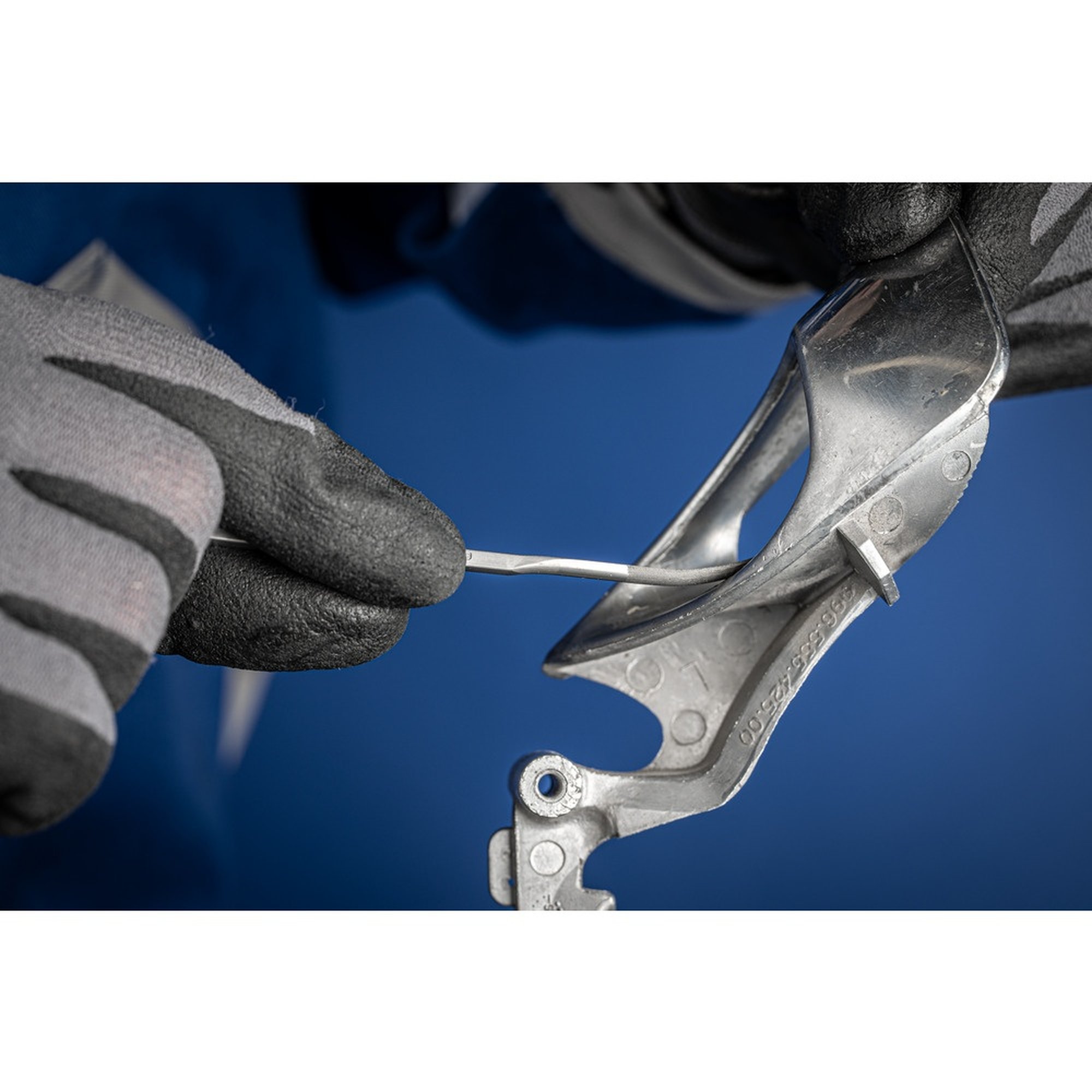 Dank des ergonomischen Griffes liegt die Feile gut in der Hand und ermöglicht eine präzise Führung. Der Griff ist aus Kunststoff gefertigt und bietet eine rutschfeste Oberfläche, die ein Abrutschen während der Arbeit verhindert.