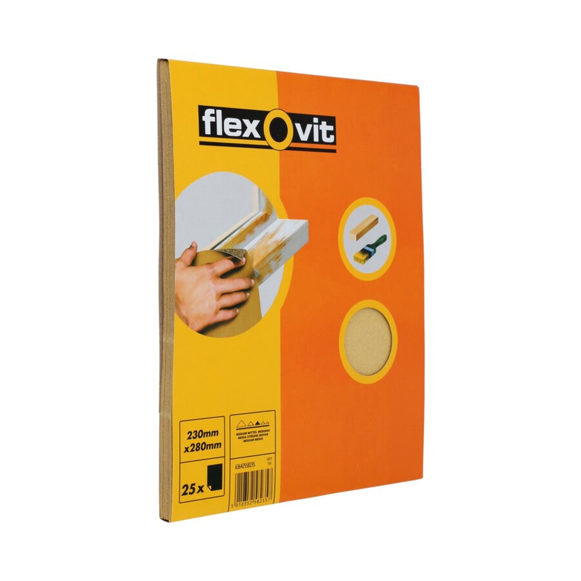 25 hochwertige Schleifbögen von Flexovit, 230x280mm, Körnung 100, ideal für Holz und Lacke. Optimiert für Handschliff und Schwingschleifer.,