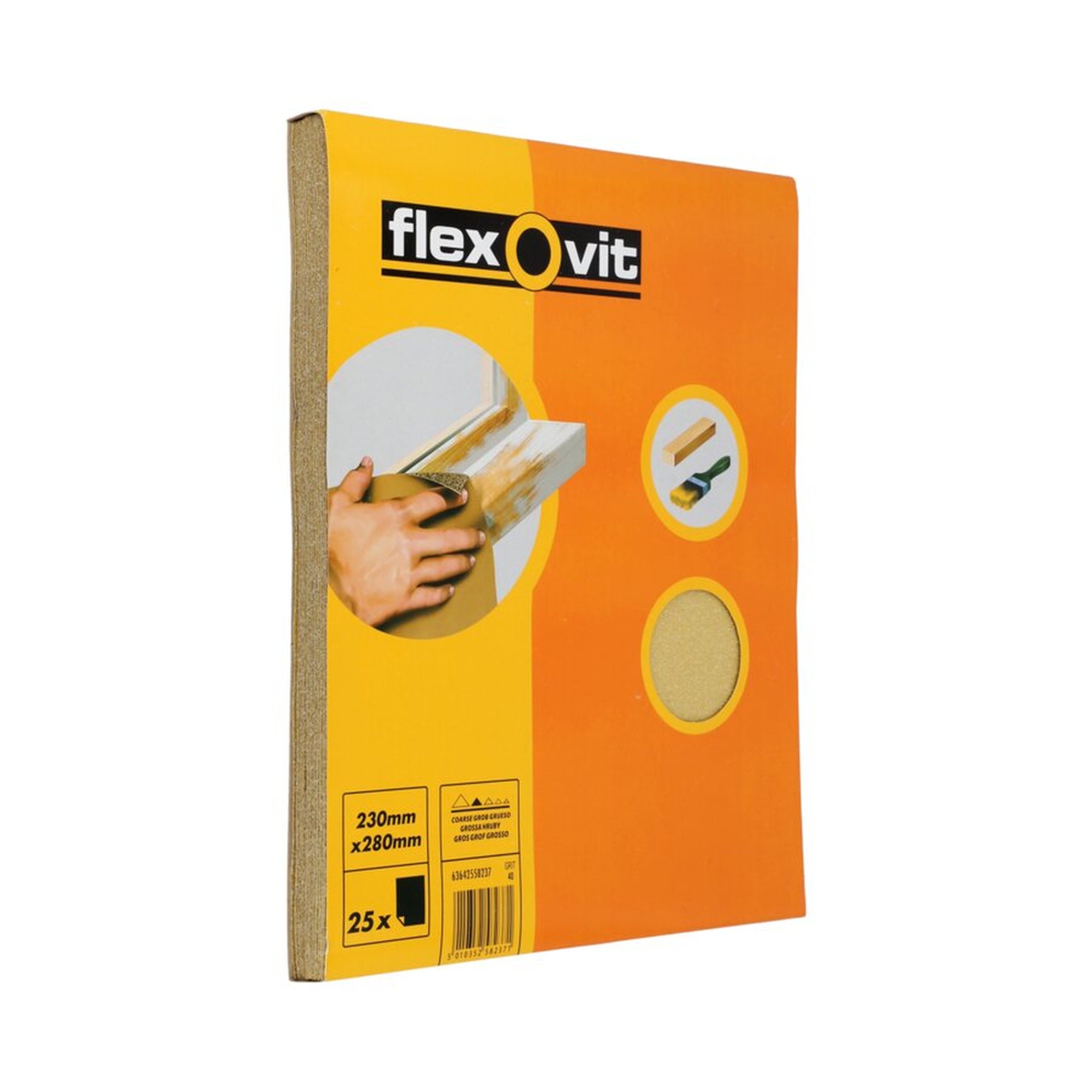 Die Flexovit MERCHANDISING Schleifbögen in der Größe 230x280mm mit einer Körnung von K40 sind speziell für effizientes Schleifen in verschiedenen Anwendungsbereichen konzipiert. Dieses Set besteht aus 25 hochwertigen Bögen, die ideal für die Bearbeitung von Holz und Spanplatten sowie für das Entfernen von Farben und Lacken geeignet sind.